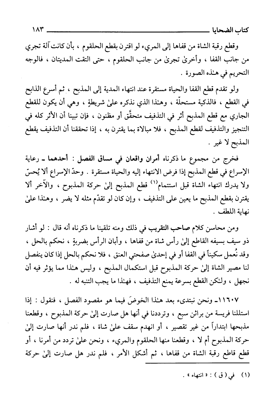 ومن محاسن كلام صاحب التقريب في ذلك ومنه تلقينا ما ذكرناه أنه قال: لو أشار ذو سيف بسيفه القاطع إلى رأس شاة من قفاها، وأبان الرأس بضربةٍ، نحكم بالحل، وقد نُعمل سكيناً في القفا أو في إحدى صفحتي العنق، فلا نحكم بالحل إذا كان ينفصل لنا مصير الشاة إلى حركة المذبوح قبل استكمال المذبح، وليس هذا مما يؤثر فيه أن نجهل، ولكن القطع بسرعة يمنع التذفيف، فهذا ما يجب التنبه له.