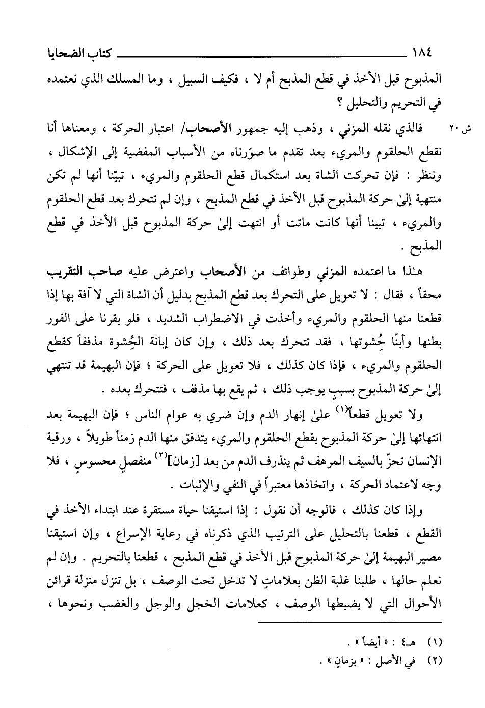 فالذي نقله المزني، وذهب إليه جمهور الأصحاب اعتبار الحركة، ومعناها أنا نقطع الحلقوم والمريء بعد تقدم ما صوّرناه من الأسباب المفضية إلى الإشكال، وننظر: فإن تحركت الشاة بعد استكمال قطع الحلقوم والمريء، تبيّنا أنها لم تكن منتهية إلى حركة المذبوح قبل الأخذ في قطع المذبح، وإن لم تتحرك بعد قطع الحلقوم والمريء، تبينا أنها كانت ماتت أو انتهت إلى حركة المذبوح قبل الأخذ في قطع المذبح.