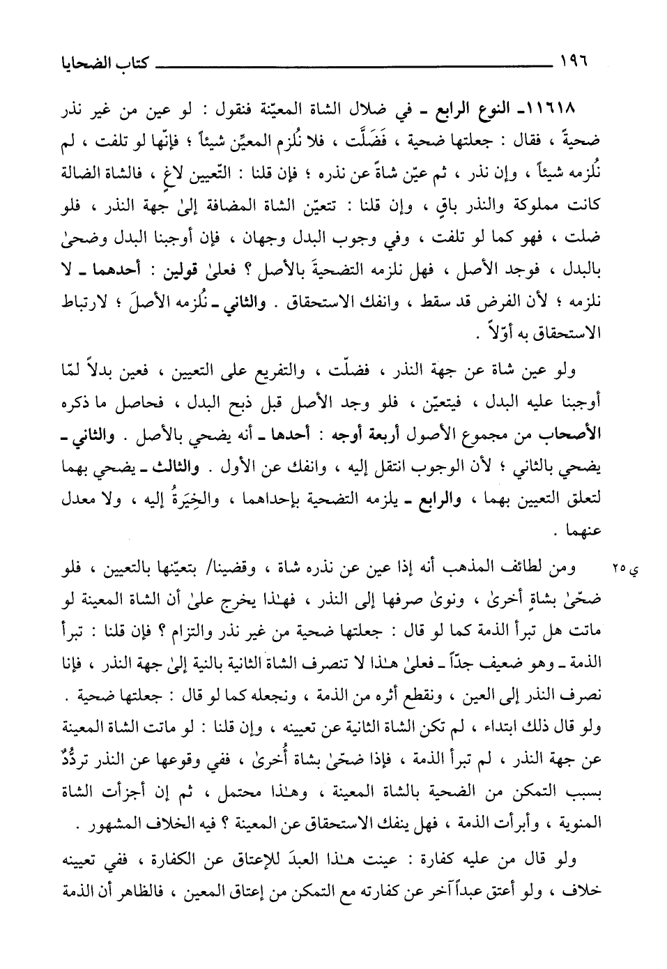 11618 - النوع الرابع - في ضلال الشاة المعيّنة فنقول: لو عين من غير نذر ضحيةً، فقال: جعلتها ضحية، فَضَلَّت، فلا نُلزم المعيِّن شيئاً؛ فإنّها لو تلفت، لم نُلزمه شيئاً، وإن نذر، ثم عيّن شاةً عن نذره؛ فإن قلنا: التّعيين لاغٍ، فالشاة الضالة كانت مملوكة والنذر باقٍ، وإن قلنا: تتعيّن الشاة المضافة إلى جهة النذر، فلو ضلت، فهو كما لو تلفت، وفي وجوب البدل وجهان، فإن أوجبنا البدل وضحى بالبدل، فوجد الأصل، فهل نلزمه التضحيةَ بالأصل؟ فعلى قولين: أحدهما - لا نلزمه؛ لأن الفرض قد سقط، وانفك الاستحقاق. والثاني - نُلزمه الأصلَ؛ لارتباط الاستحقاق به أوّلاً.