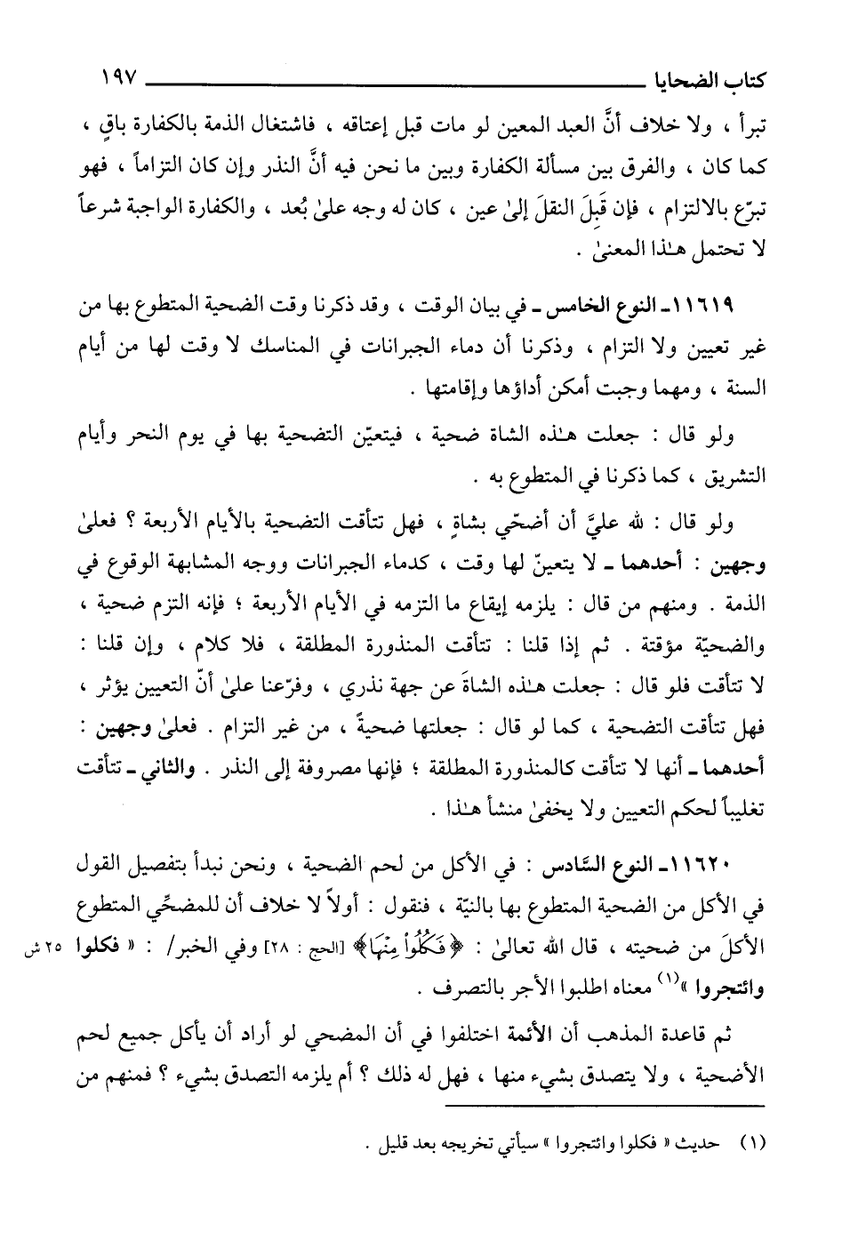 11620 - النوع السَّادس: في الأكل من لحم الضحية، ونحن نبدأ بتفصيل القول في الأكل من الضحية المتطوع بها بالنيّة، فنقول: أولاً لا خلاف أن للمضحِّي المتطوع الأكلَ من ضحيته، قال الله تعالى: {فَكُلُوا مِنْهَا} [الحج: 28]، وفي الخبر: " فكلوا وائتجروا " (1) معناه اطلبوا الأجر بالتصرف.