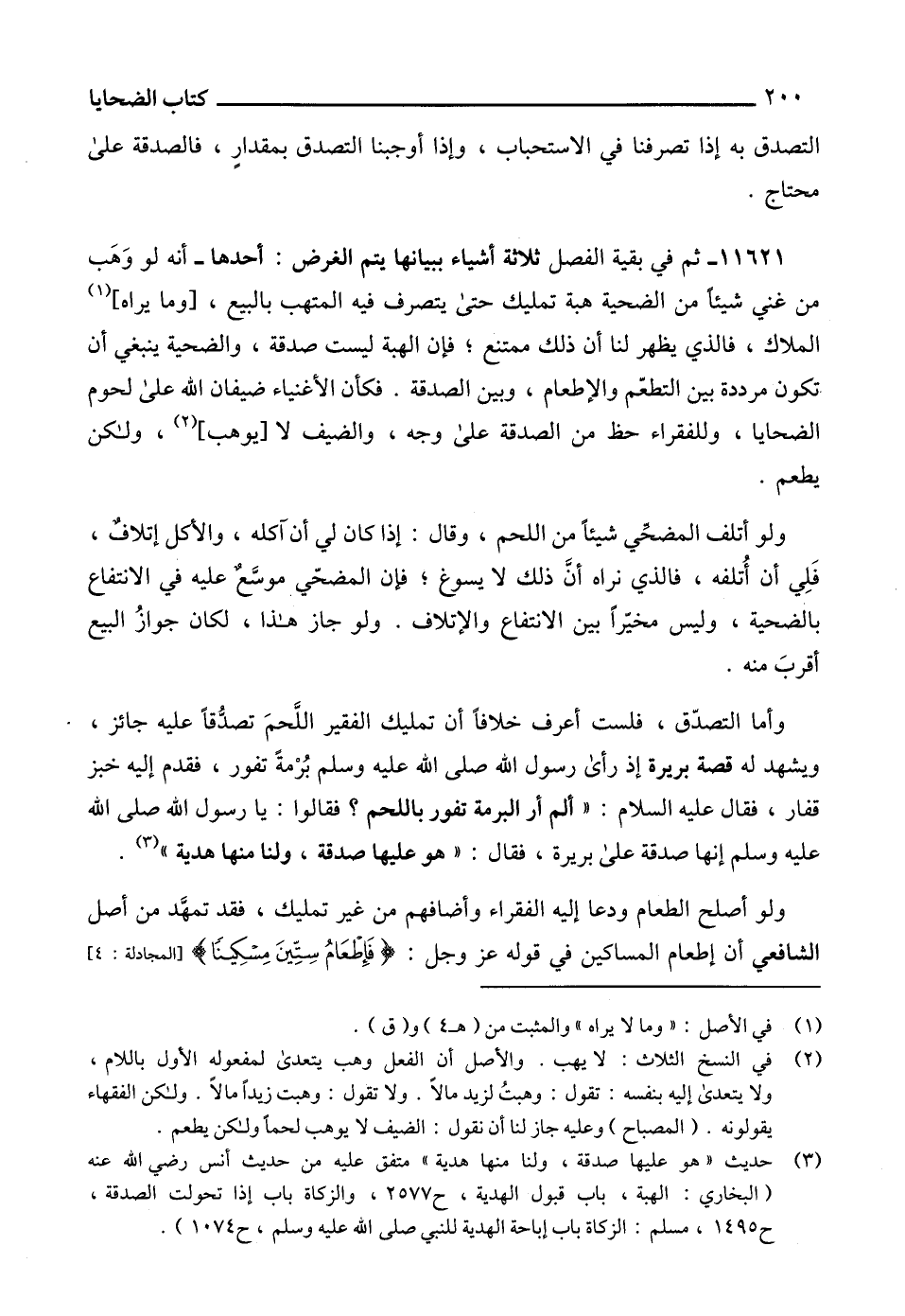 وأما التصدّق، فلست أعرف خلافاً أن تمليك الفقير اللَّحمَ تصدُّقاً عليه جائز، ويشهد له قصة بريرة إذ رأى رسول الله صلى الله عليه وسلم بُرْمةً تفور، فقدم إليه خبز قفار، فقال عليه السلام: " ألم أر البرمة تفور باللحم؟ فقالوا: يا رسول الله صلى الله عليه وسلم إنها صدقة على بريرة، فقال: " هو عليها صدقة، ولنا منها هدية " (3).