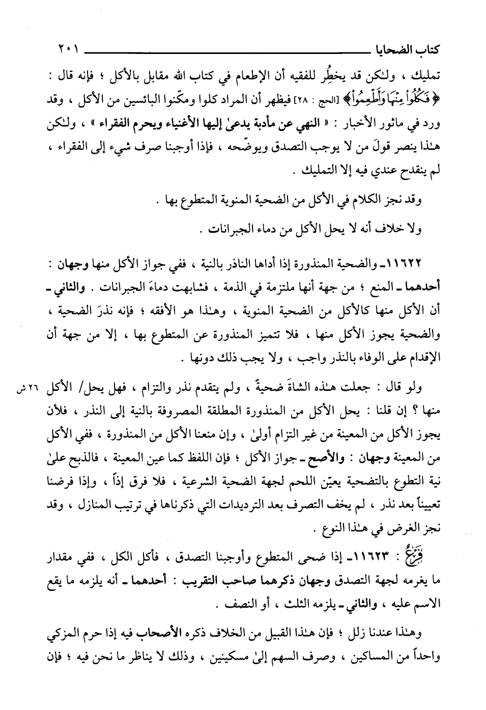 11622 - والضحية المنذورة إذا أداها الناذر بالنية، ففي جواز الأكل منها وجهان: أحدهما - المنع؛ من جهة أنها ملتزمة في الذمة، فشابهت دماءَ الجبرانات. والثاني - أن الأكل منها كالأكل من الضحية المنوية، وهذا هو الأفقه؛ فإنه نذرَ الضحية، والضحية يجوز الأكل منها، فلا تتميز المنذورة عن المتطوع بها، إلا من جهة أن الإقدام على الوفاء بالنذر واجب، ولا يجب ذلك دونها.