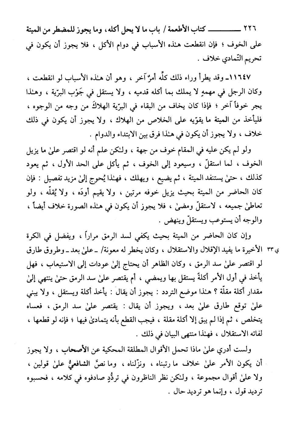 11647 - وقد يطرأ وراء ذلك كلِّه أمرٌ آخر، وهو أن هذه الأسباب لو انقطعت، وكان الرجل في مهمهٍ لا يملك بما أكله قدميه، ولا يستقل في جَوْب البرّية، وهذا يجر خوفاً آخر؛ فإذا كان يخاف من البقاء في البرّية الهلاكَ من وجه من الوجوه، فليأخذ من الميتة ما يقوّيه على الخلاص من الهلاك، ولا يجوز أن يكون في ذلك خلاف، ولا يجوز أن يكون في هذا فرق بين الابتداء والدوام.