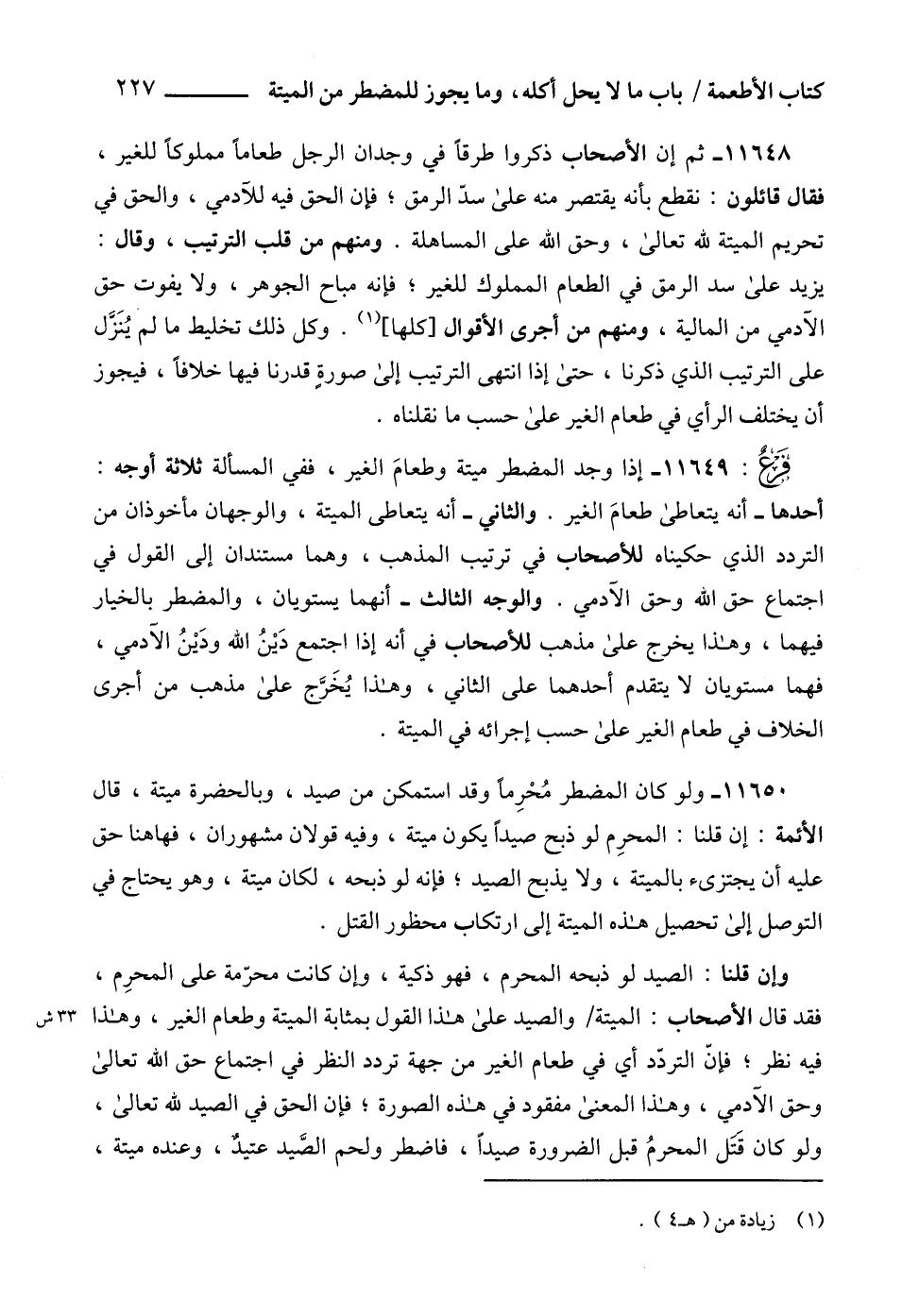 11648 - ثم إن الأصحاب ذكروا طرقاً في وجدان الرجل طعاماً مملوكاً للغير، فقال قائلون: نقطع بأنه يقتصر منه على سدّ الرمق؛ فإن الحق فيه للآدمي، والحق في تحريم الميتة لله تعالى، وحق الله على المساهلة. ومنهم من قلب الترتيب، وقال: يزيد على سد الرمق في الطعام المملوك للغير؛ فإنه مباح الجوهر، ولا يفوت حق الآدمي من المالية، ومنهم من أجرى الأقوال [كلها] (1). وكل ذلك تخليط ما لم يُنَزَّل على الترتيب الذي ذكرنا، حتى إذا انتهى الترتيب إلى صورةٍ قدرنا فيها خلافاً، فيجوز أن يختلف الرأي في طعام الغير على حسب ما نقلناه.