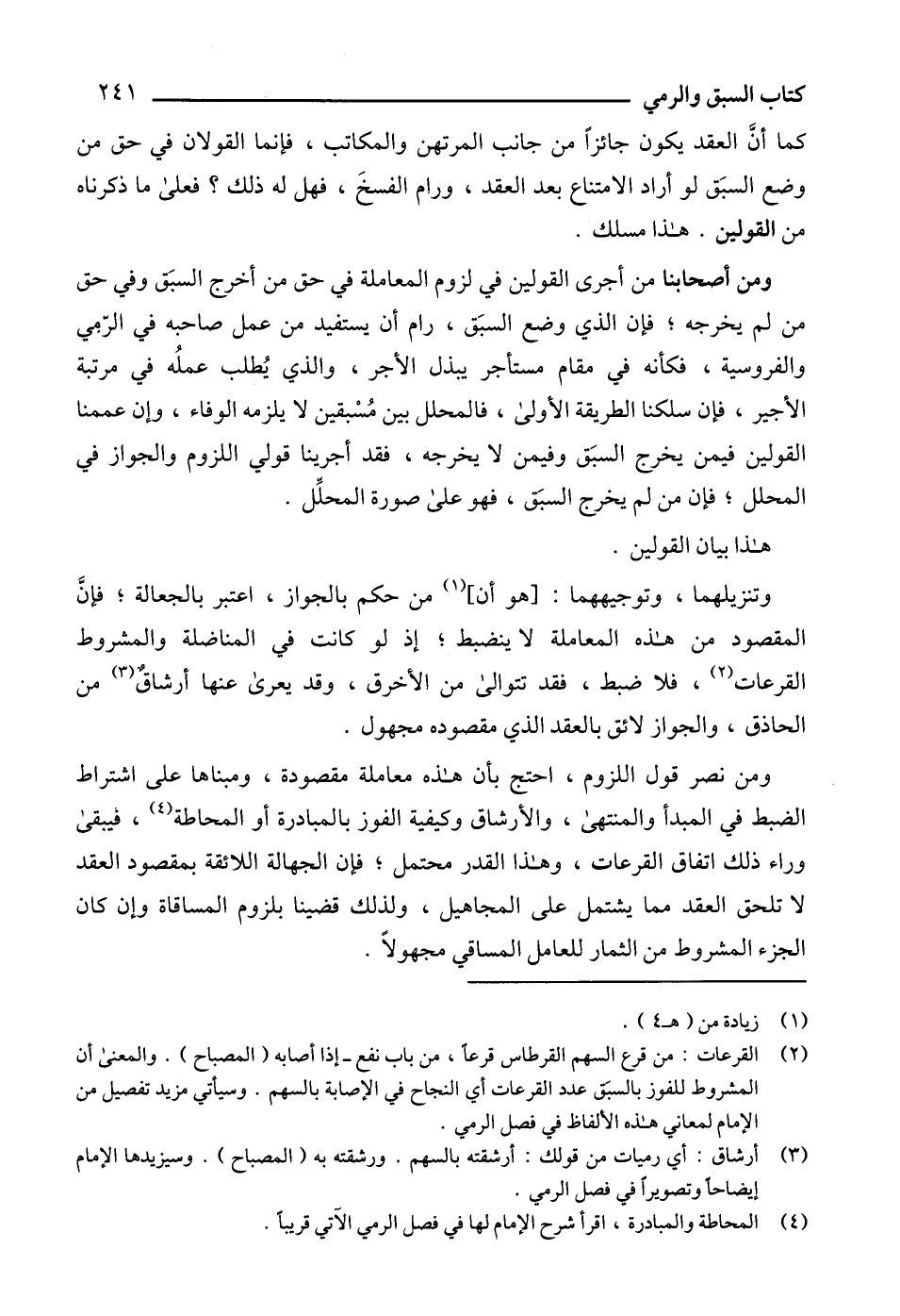 (2) القرعات: من قرع السهم القرطاس قرعاً، من باب نفع- إذا أصابه (المصباح). والمعنى أن المشروط للفوز بالسبَق عدد القرعات أي النجاح في الإصابة بالسهم. وسيأتي مزيد تفصيل من الإمام لمعاني هذه الألفاظ في فصل الرمي.