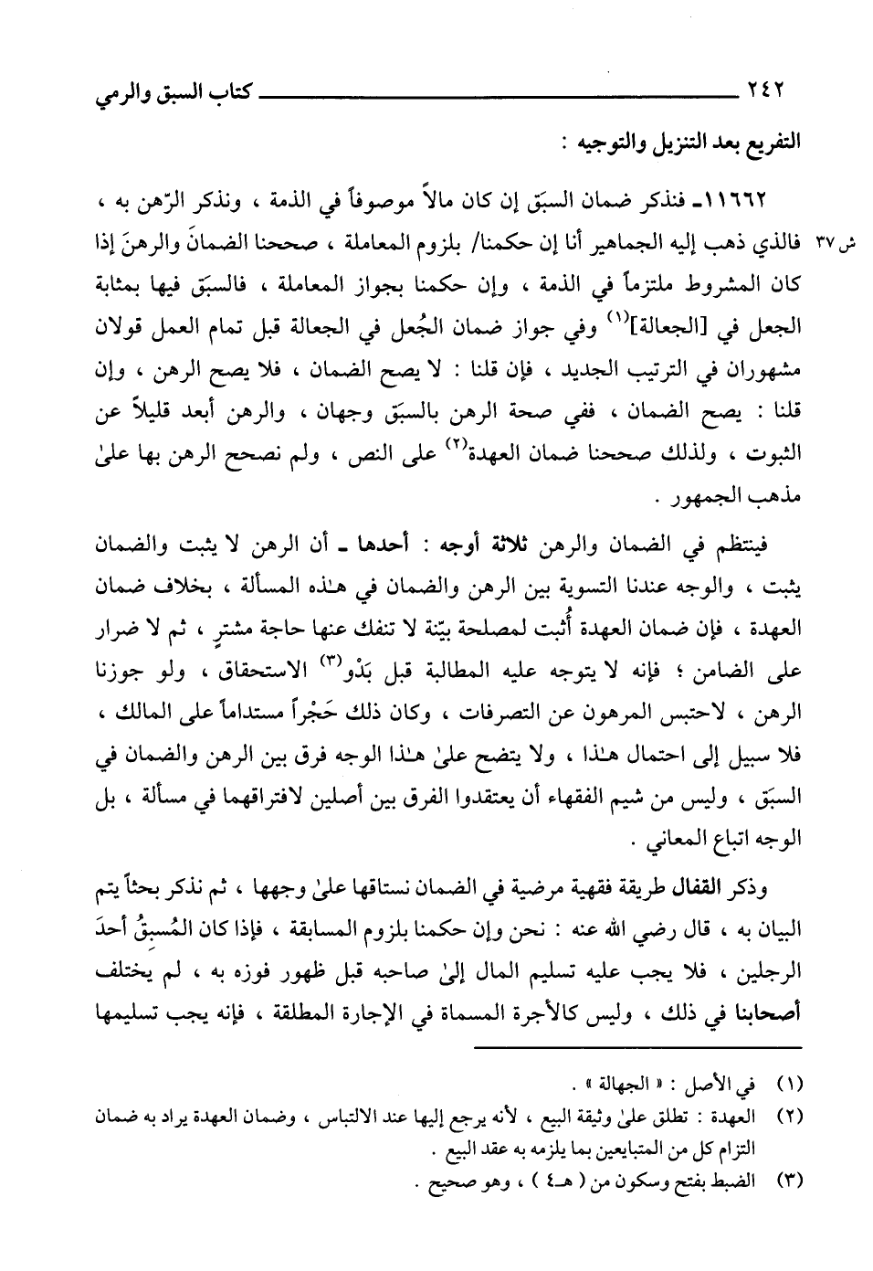 11662 - فنذكر ضمان السبَق إن كان مالاً موصوفاً في الذمة، ونذكر الرّهن به، فالذي ذهب إليه الجماهير أنا إن حكمنا بلزوم المعاملة، صححنا الضمانَ والرهنَ إذا كان المشروط ملتزماً في الذمة، وإن حكمنا بجواز المعاملة، فالسبَق فيها بمثابة الجعل في [الجعالة] (1) وفي جواز ضمان الجُعل في الجعالة قبل تمام العمل قولان مشهوران في الترتيب الجديد، فإن قلنا: لا يصح الضمان، فلا يصح الرهن، وإن قلنا: يصح الضمان، ففي صحة الرهن بالسبَق وجهان، والرهن أبعد قليلاً عن الثبوت، ولذلك صححنا ضمان العهدة (2) على النص، ولم نصحح الرهن بها على مذهب الجمهور.