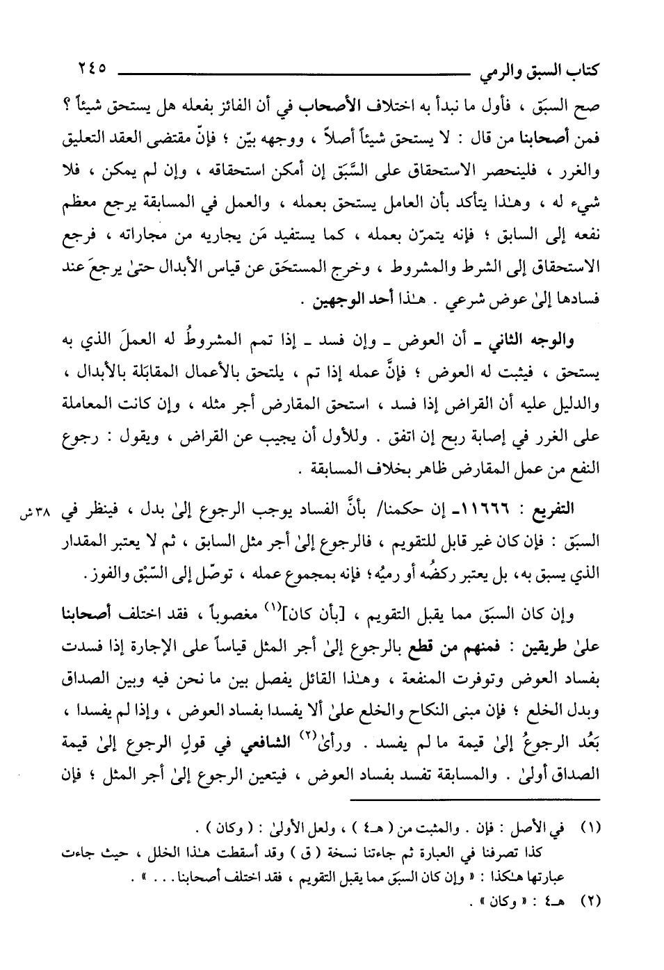 (1) في الأصل: فإن. والمثبت من (هـ 4)، ولعل الأولى: (وكان). كذا تصرفنا في العبارة ثم جاءتنا نسخة (ق) وقد أسقطت هذا الخلل، حيث جاءت عبارتها هكذا: " وإن كان السبَق مما يقبل التقويم، فقد اختلف أصحابنا ... ".