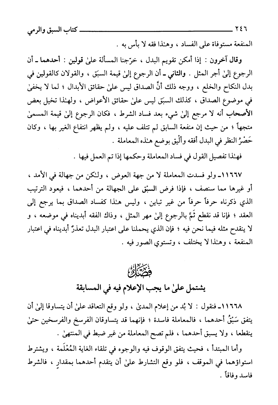 11668 - فنقول: لا بُد من إعلام المدى، ولو وقع التعاقد على أن يتساوقا إلى أن يتفق سَبْقُ أحدهما، فالمعاملة فاسدة؛ فإنهما قد يتساوقان الفرسخ والفرسخين حتى ينقطعا، ولا يسبق أحدهما، فلم تصح المعاملة من غير ضبط في المنتهى.