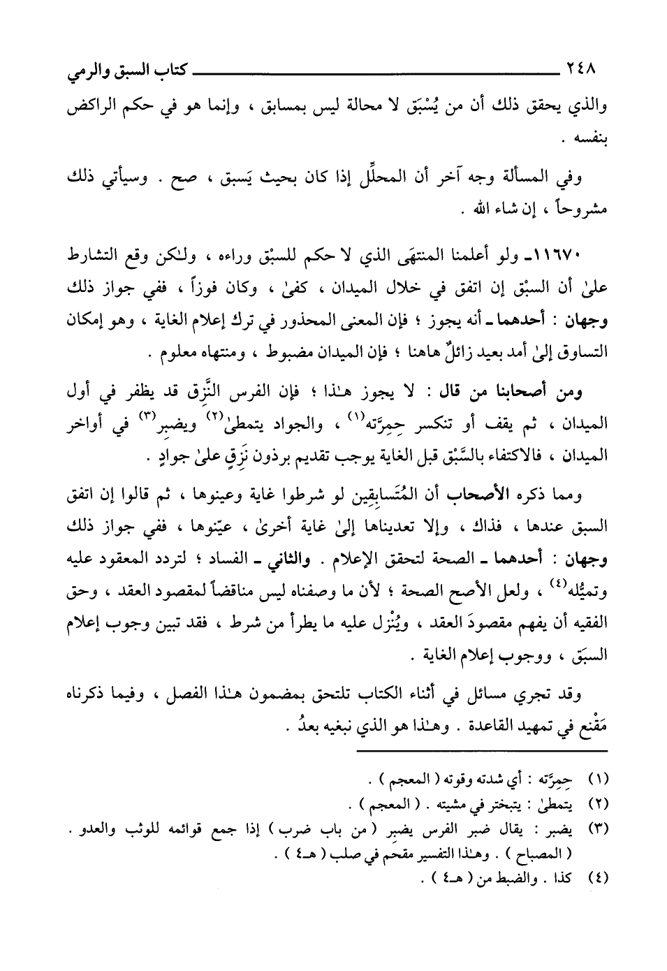11670 - ولو أعلمنا المنتهَى الذي لا حكم للسبْق وراءه، ولكن وقع التشارط على أن السبْق إن اتفق في خلال الميدان، كفى، وكان فوزاً، ففي جواز ذلك وجهان: أحدهما - أنه يجوز؛ فإن المعنى المحذور في ترك إعلام الغاية، وهو إمكان التساوق إلى أمد بعيد زائلٌ هاهنا؛ فإن الميدان مضبوط، ومنتهاه معلوم.