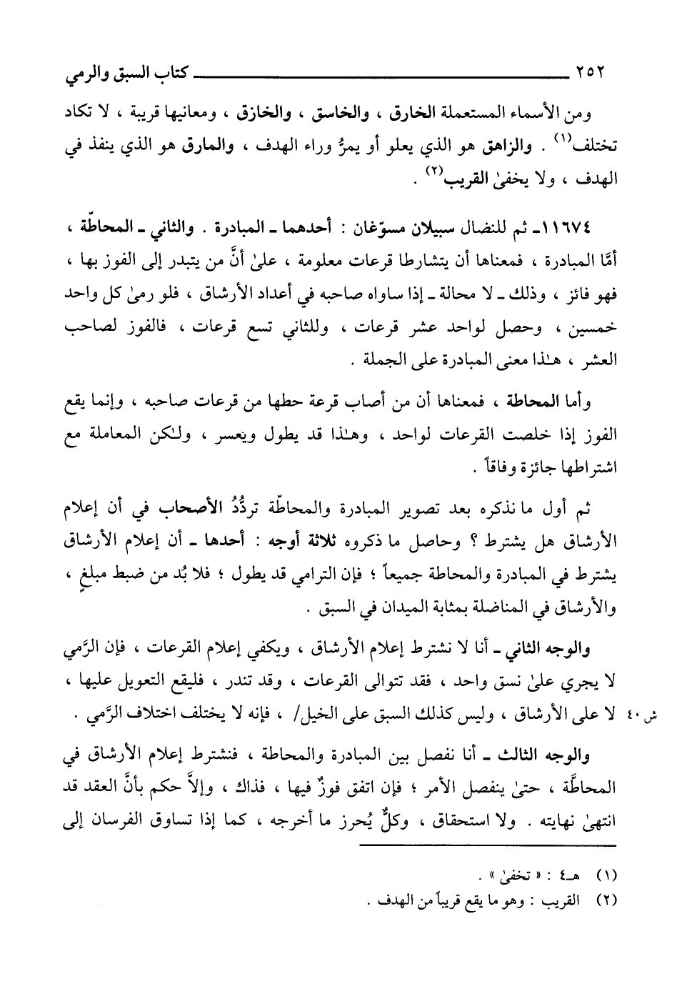 11674 - ثم للنضال سبيلان مسوّغان: أحدهما - المبادرة. والثاني - المحاطّة، أمَّا المبادرة، فمعناها أن يتشارطا قرعات معلومة، على أنَّ من يتبدر إلى الفوز بها، فهو فائز، وذلك -لا محالة- إذا ساواه صاحبه في أعداد الأرشاق، فلو رمى كل واحد خمسين، وحصل لواحد عشر قرعات، وللثاني تسع قرعات، فالفوز لصاحب العشر، هذا معنى المبادرة على الجملة.