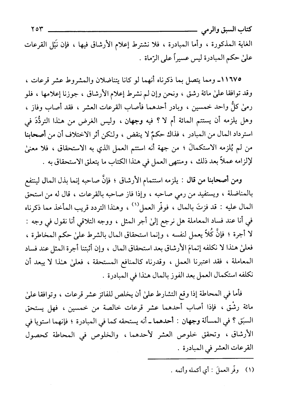 ومن أصحابنا من قال: يلزمه استتمام الأرشاق؛ فإنَّ صاحبه إنما بذل المال لينتفع بالمناضلة، ويستفيد من رمي صاحبه، وإذا فاز صاحبه بالقرعات، قال له من استحق المال عليه: قد فزتَ بالمال، فوفّر العمل (1)، وهذا التردد قريب المأخذ مما ذكرناه في أنا عند فساد المعاملة هل نرجع إلى أجر المثل، ووجه التلاقي أنا نقول في وجه: لا أجرة؛ فإنَّ كُلاً يعمل لنفسه، وإنما استحقاق المال بالشرط على حكم المخاطرة، فعلى هذا لا نكلفه إتمامَ الأرشاق بعد استحقاق المال، وإن أثبتنا أجرة المثل عند فساد المعاملة، فقد اعتبرنا العمل، وقدرناه كالمنافع المستحقة، فعلى هذا لا يبعد أن نكلفه استكمال العمل بعد الفوز بالمال هذا في المبادرة.