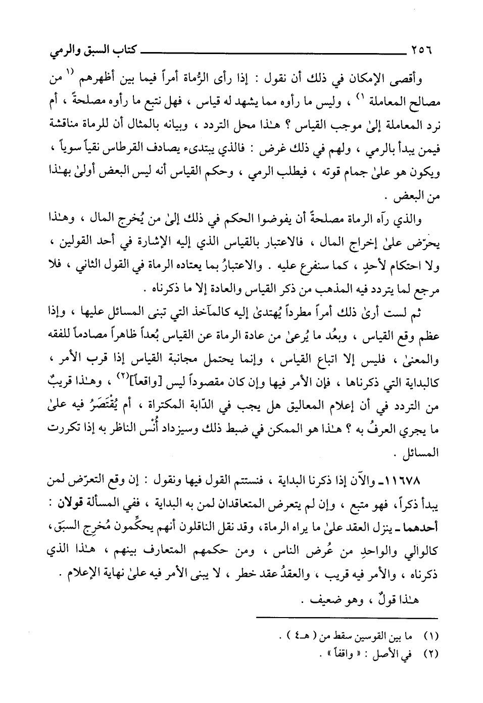 ثم لست أرى ذلك أمراً مطرداً يُهتدى إليه كالمآخذ التي تبنى المسائل عليها، وإذا عظم وقع القياس، وبعُد ما يُرعى من عادة الرماة عن القياس بُعداً ظاهراً مصادماً للفقه والمعنى، فليس إلا اتباع القياس، وإنما يحتمل مجانبة القياس إذا قرب الأمر، كالبداية التي ذكرناها، فإن الأمر فيها وإن كان مقصوداً ليس [واقعاً] (2)، وهذا قريبٌ من التردد في أن إعلام المعاليق هل يجب في الدّابة المكتراة، أم يُقْتَصَرُ فيه على ما يجري العرفُ به؟ هذا هو الممكن في ضبط ذلك وسيزداد أُنْس الناظر به إذا تكررت المسائل.