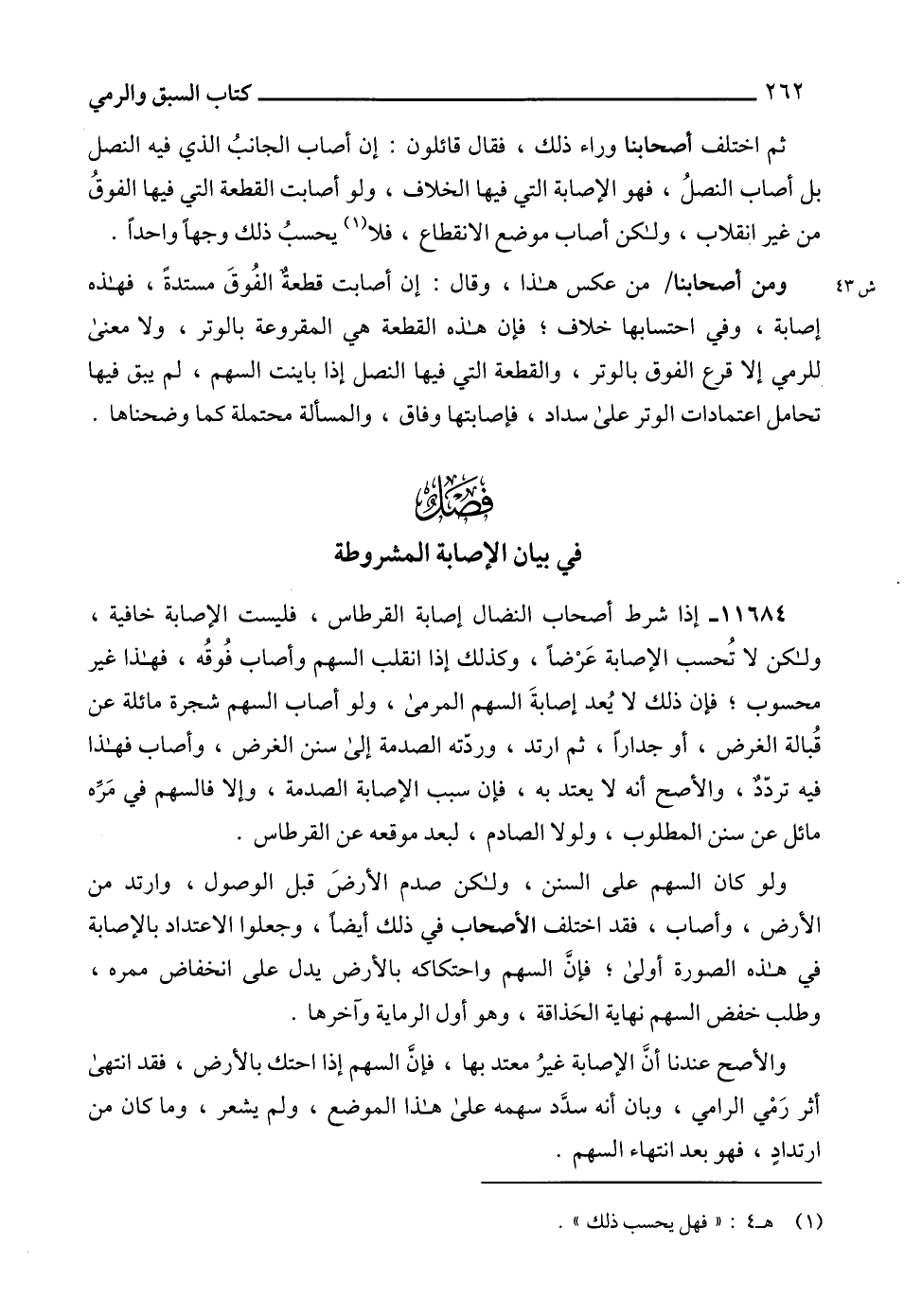 11684 - إذا شرط أصحاب النضال إصابة القرطاس، فليست الإصابة خافية، ولكن لا تُحسب الإصابة عَرْضاً، وكذلك إذا انقلب السهم وأصاب فُوقُه، فهذا غير محسوب؛ فإن ذلك لا يُعد إصابةَ السهم المرمى، ولو أصاب السهم شجرة مائلة عن قُبالة الغرض، أو جداراً، ثم ارتد، وردّته الصدمة إلى سنن الغرض، وأصاب فهذا فيه تردّدٌ، والأصح أنه لا يعتد به، فإن سبب الإصابة الصدمة، وإلا فالسهم في مَرِّه مائل عن سنن المطلوب، ولولا الصادم، لبعد موقعه عن القرطاس.