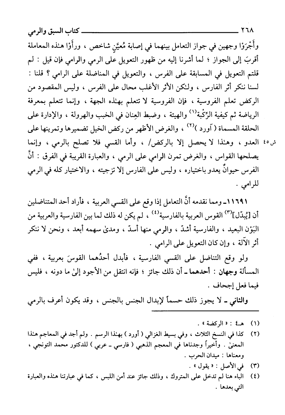 11691 - ومما نقدمه أنَّ التعامل إذا وقع على القسي العربية، فأراد أحد المتناضلين أن [يُبدّل] (3) القوس العربية بالفارسية (4)، لم يكن له ذلك لما بين الفارسية والعربية من البَوْن البعيد، والفارسية أشدّ، والرمي منها أسدّ، ومدى سهمه أبعد، ونحن لا ننكر أثر الآلة، وإن كان التعويل على الرامي.