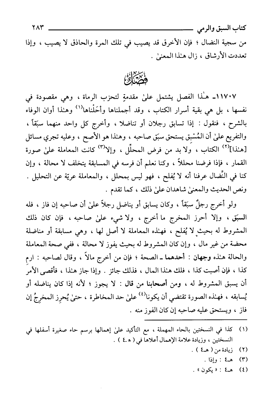 11707 - هذا الفصل يشتمل على مقدمةٍ لتحزب الرماة، وهي مقصودة في نفسها، بل هي بقية أسرار الكتاب، وقد أجملناها وأحَلْناها (1) وهذا أوان الوفاء بالشرح، فنقول: إذا تسابق رجلان أو تناضلا، وأخرج كل واحد منهما سبَقاً، والتفريع على أن المُسْبق يستحق سبَق صاحبه، وهذا هو الأصح، وعليه تجري مسائل [هذا] (2) الكتاب، وَلا بد من فرض المحلِّل، وإلا (3) كانت المعاملة على صورة القمار، فإذا فرضنا محللاً، وكنا نعلم أن فرسه في المسابقة يتخلف لا محالة، وإن كنا في النِّضال عرفنا أنه لا يُفلح، فهو ليس بمحلل، والمعاملة عريّة عن التحليل.