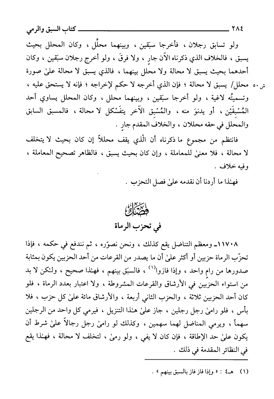11708 - ومعظم التناضل يقع كذلك، ونحن نصوّره، ثم نندفع في حكمه، فإذا تحرب الرماة حزبين أو أكثر على أن ما يصدر من القرعات من أحد الحزبين يكون بمثابة صدورها من رامٍ واحد، وإذا فازوا (1)، فالسبَق بينهم، فهذا صحيح، ولكن لا بد من استواء الحزبين في الأرشاق والقرعات المشروطة، ولا اعتبار بعدد الرماة، فلو كان أحد الحزبين ثلاثة، والحزب الثاني أربعة، والأرشاق مائة على كل حزب، فلا بأس، فلو رامى رجل رجلين، جاز على هذا التنزيل، فيرمي كل واحد من الرجلين سهماً، ويرمي المناضل لهما سهمين، وكذلك لو رامى رجل رجالاً على شرط أن يكون على حد الإطاقة، فإن كان لا يفي، ولو رمى، لتخلف لا محالة، فهذا يقع في النظائر المقدمة في ذلك.