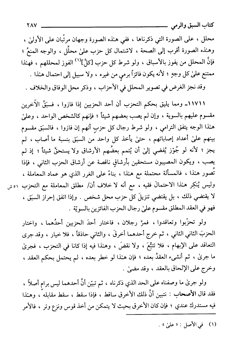 11711 - ومما يليق بحكم التحزب أن أحد الحزبين إذا فازوا، فسبَقُ الآخرين مقسوم عليهم بالسوية، وإن لم يصب بعضهم شيئاً؛ فإنهم كالشخص الواحد، وعلى هذا الوجه يتفق الترامي، ولو شرط رجال كل حزبٍ أنهم إن فازوا، فالسبَق مقسوم بينهم على أعداد إصاباتهم، حتى يأخذ كل واحد من السبَق بنسبة ما أصاب، لم يجز؛ لأنه لو جُوّز يُفضي إلى أن يُتمم بعضُهم الأرشاق ولا يستحقَّ شيئاً؛ إذ لم يصب، ويكون المصيبون مستحقين بأرشاقٍ ناقصة عن أرشاق الحزب الثاني، فإذا تُصور هذا، فالمسألة محتملة مع هذا، بناءً على الغرر الذي هو عماد المعاملة، وليس يُنكِر هذا الاحتمالَ فقيه، مع أنه لا خلاف أن مطلق المعاملة مع التحزب لا يقتضي ذلك، بل يقتضي تنزيلَ كل حزب محل شخص. وإذا اتفق إحراز السبَق، فهو في العقد المطلق مقسوم على رجال الحزب الفائزين بالسويّة.