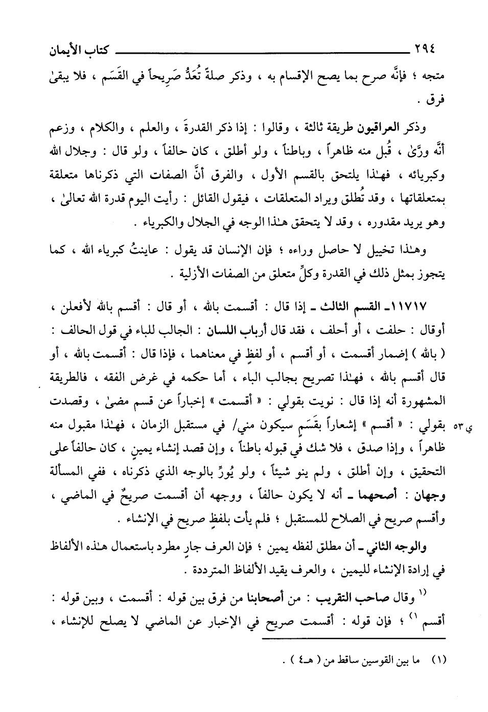 وذكر العراقيون طريقة ثالثة، وقالوا: إذا ذكر القدرةَ، والعلم، والكلام، وزعم أنَّه ورَّى، قُبل منه ظاهراً، وباطناً، ولو أطلق، كان حالفاً، ولو قال: وجلال الله وكبريائه، فهذا يلتحق بالقسم الأول، والفرق أنَّ الصفات التي ذكرناها متعلقة بمتعلقاتها، وقد تُطلق ويراد المتعلقات، فيقول القائل: رأيت اليوم قدرة الله تعالى، وهو يريد مقدوره، وقد لا يتحقق هذا الوجه في الجلال والكبرياء.