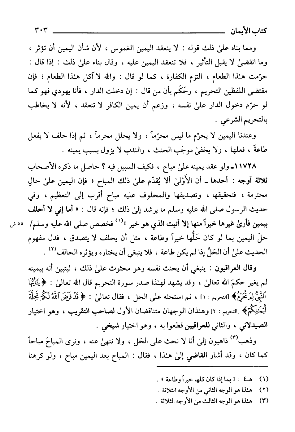 وقال العراقيون: ينبغي أن يحنث نفسه وهو محثوث على ذلك، ليتبين أنه بيمينه لم يغير حكمَ الله تعالى، وقد يشهد لهذا صدر سورة التحريم قال الله تعالى: {يَا أَيُّهَا النَّبِيُّ لِمَ تُحَرِّمُ} [التحريم: 1]، ثم استحثه على الحل، فقال تعالى: {قَدْ فَرَضَ اللَّهُ لَكُمْ تَحِلَّةَ أَيْمَانِكُمْ} [التحريم: 2]، وهذان الوجهان متناقضان الأول لصاحب التقريب، وهو اختيار الصيدلاني، والثاني للعراقيين قطعوا به، وهو اختيار شيخي.