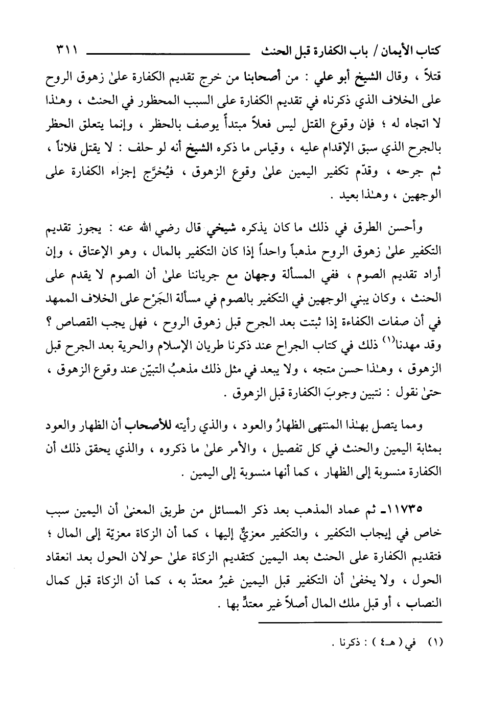 11735 - ثم عماد المذهب بعد ذكر المسائل من طريق المعنى أن اليمين سبب خاص في إيجاب التكفير، والتكفير معزيٌّ إليها، كما أن الزكاة معزيّة إلى المال؛ فتقديم الكفارة على الحنث بعد اليمين كتقديم الزكاة على حولان الحول بعد انعقاد الحول، ولا يخفى أن التكفير قبل اليمين غيرُ معتدّ به، كما أن الزكاة قبل كمال النصاب، أو قبل ملك المال أصلاً غير معتدٍّ بها.