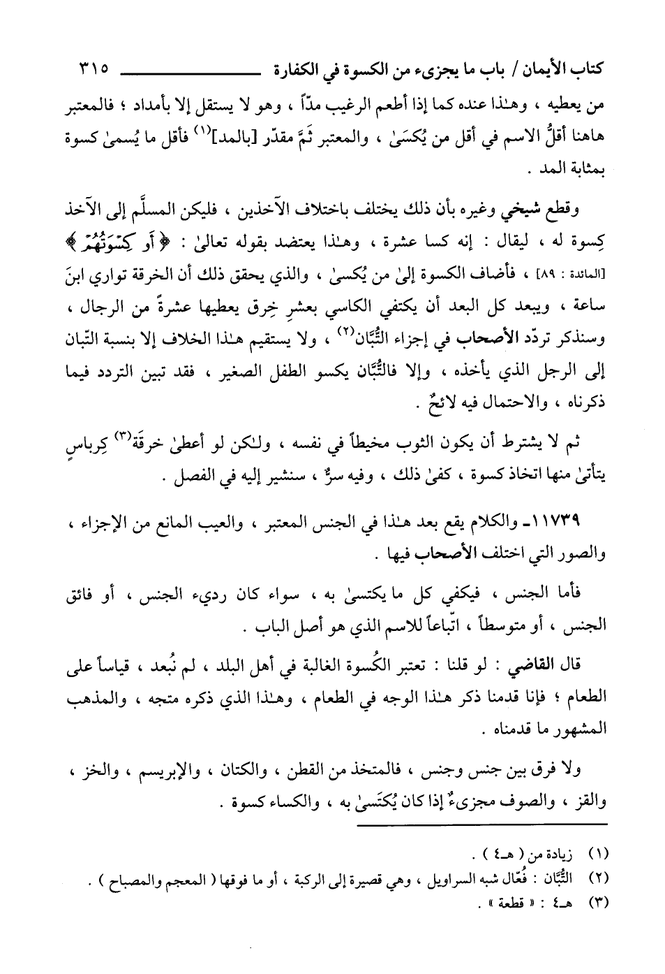 وقطع شيخي وغيره بأن ذلك يختلف باختلاف الآخذين، فليكن المسلَّم إلى الآخذ كِسوة له، ليقال: إنه كسا عشرة، وهذا يعتضد بقوله تعالى: {أَوْ كِسْوَتُهُمْ} [المائدة: 89]، فأضاف الكسوة إلى من يُكسى، والذي يحقق ذلك أن الخرقة تواري ابنَ ساعة، ويبعد كل البعد أن يكتفي الكاسي بعشرِ خِرق يعطيها عشرةً من الرجال، وسنذكر تردّد الأصحاب في إجزاء التُّبَّان (2)، ولا يستقيم هذا الخلاف إلا بنسبة التّبان إلى الرجل الذي يأخذه، وإلا فالتُّبَّان يكسو الطفل الصغير، فقد تبين التردد فيما ذكرناه، والاحتمال فيه لائحٌ.