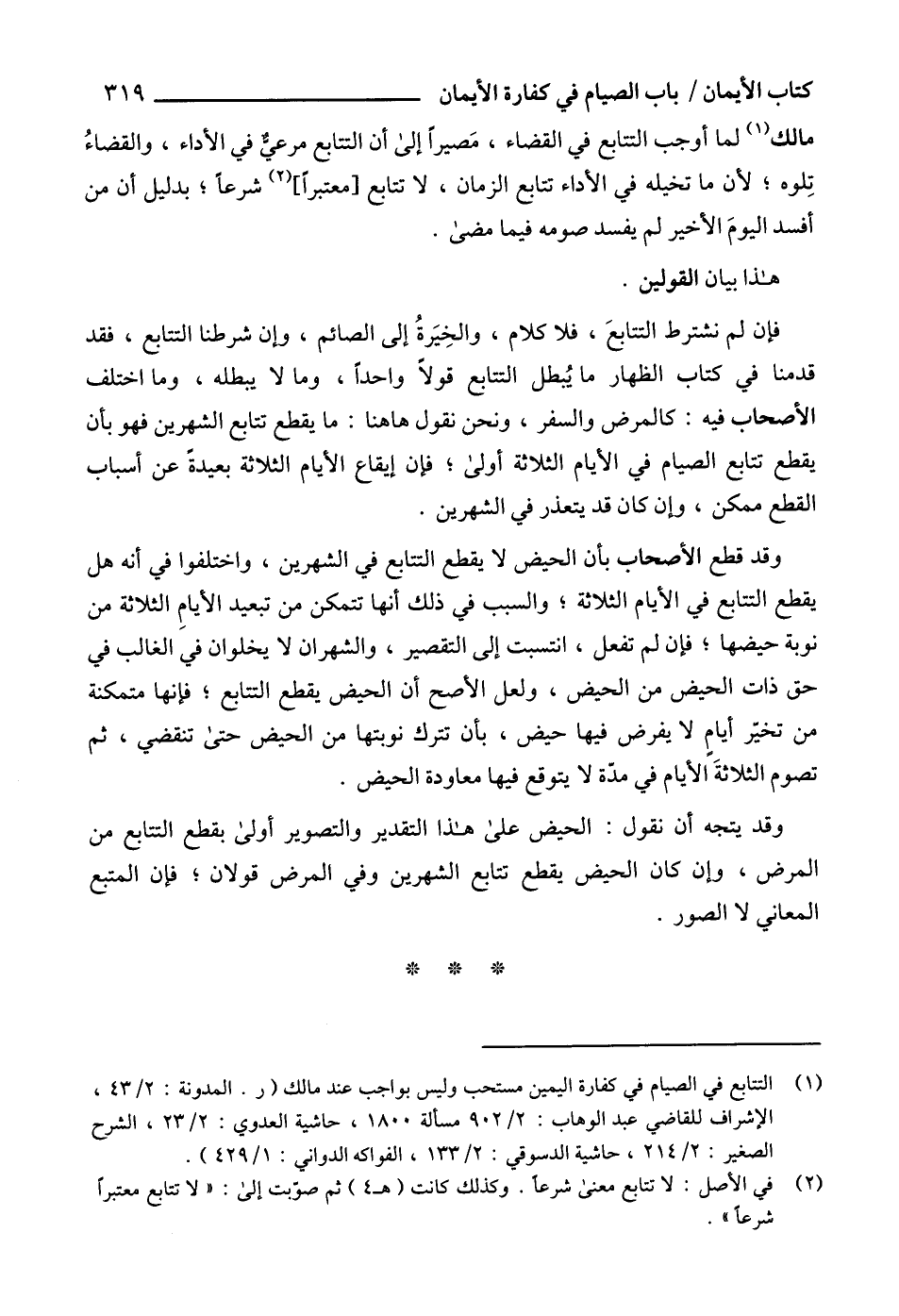 (1) التتابع في الصيام في كفارة اليمين مستحب وليس بواجب عند مالك (ر. المدونة: 2/ 43، الإشراف للقاضي عبد الوهاب: 2/ 902 مسألة 1800، حاشية العدوي: 2/ 23، الشرح الصغير: 2/ 214، حاشية الدسوقي: 2/ 133، الفواكه الدواني: 1/ 429).