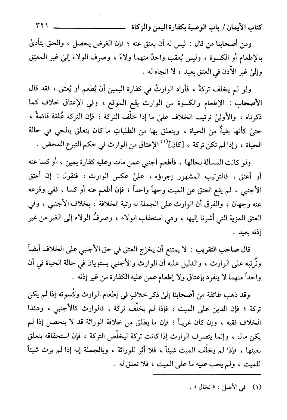 قال صاحب التقريب: لا يمتنع أن يخرّج العتق في حق الأجنبي على الخلاف أيضاً ونُرتبه على الوارث، والدليل عليه أن الوارث والأجنبي يستويان في حالة الحياة في أن واحداً منهما لا ينفرد بإعتاق ولا إطعام عمن عليه الكفارة من غير إذنه.