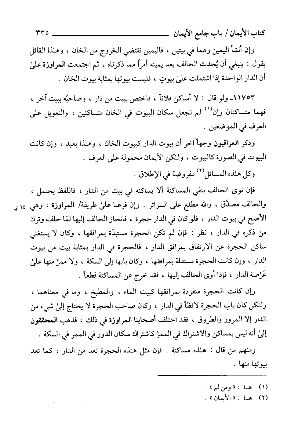 11753 - ولو قال: لا أساكن فلاناً، فاختص ببيت من دار، وصاحبُه ببيت آخر، فهما متساكنان وإن (1) لم نجعل سكان البيوت في الخان متساكنين، والتعويل على العرف في الموضعين.