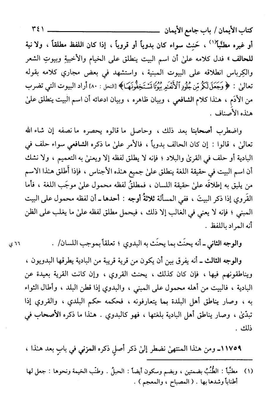 أو غيره مطنَّباً (1)، حَنِث سواء كان بدوياً أو قروياً، إذا كان اللفظ مطلقاً، ولا نية للحالف " فدل كلامه على أن اسم البيت ينطلق على الخيام والأخبيةِ وبيوتِ الشعر والكِرباس انطلاقه على البيوت المبنية، واستشهد في بعض مجاري كلامه بقوله تعالى: {وَجَعَلَ لَكُمْ مِنْ جُلُودِ الْأَنْعَامِ بُيُوتًا تَسْتَخِفُّونَهَا} [النحل: 80]، أراد البيوت التي تضرب من الأدَمِ، هذا كلام الشافعي، وبيان ظاهره، وبيان ادعائه أن اسم البيت ينطلق على هذه الأصناف.