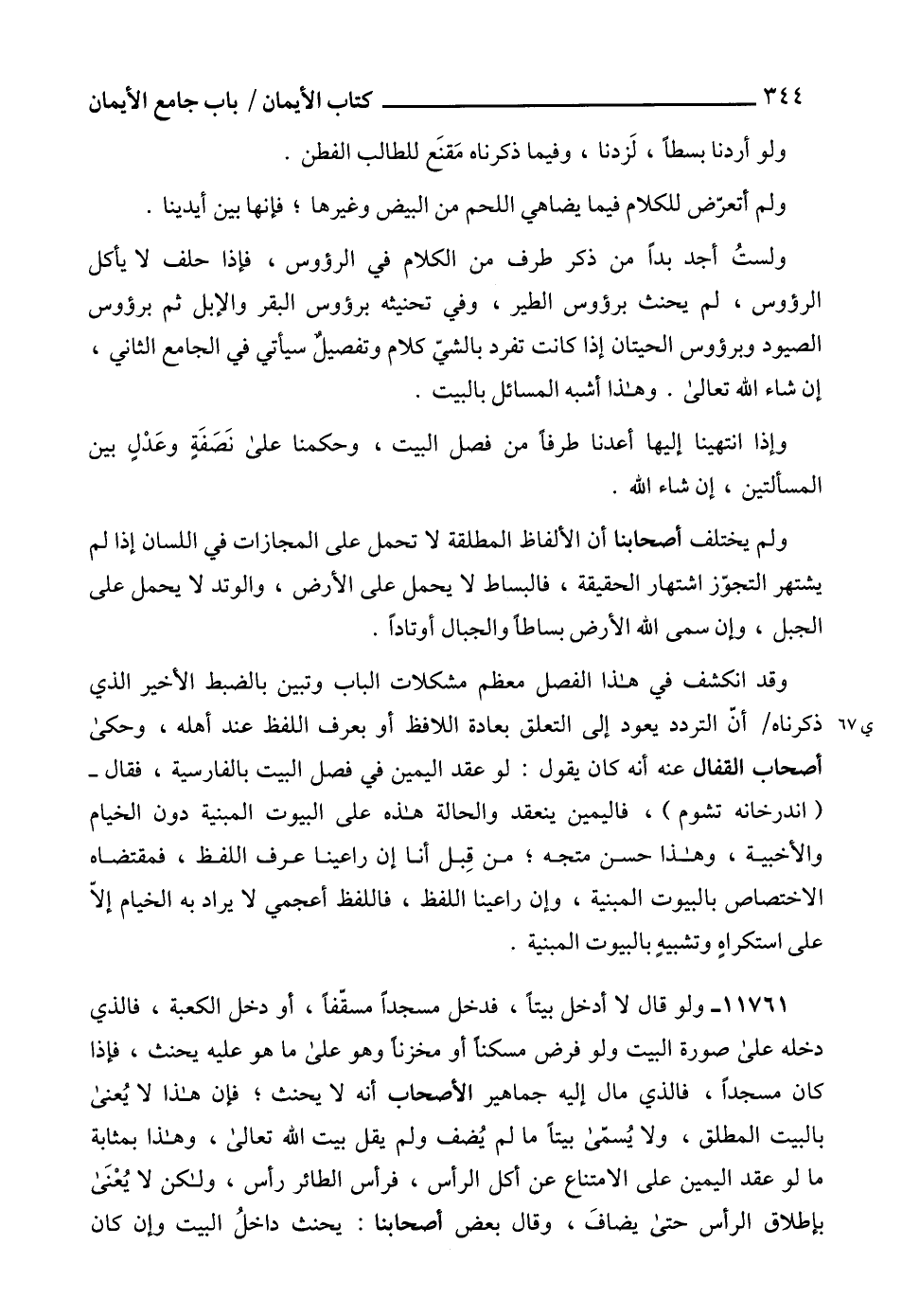 وقد انكشف في هذا الفصل معظم مشكلات الباب وتبين بالضبط الأخير الذي ذكرناه أنّ التردد يعود إلى التعلق بعادة اللافظ أو بعرف اللفظ عند أهله، وحكى أصحاب القفال عنه أنه كان يقول: لو عقد اليمين في فصل البيت بالفارسية، فقال- (اندرخانه تشوم)، فاليمين ينعقد والحالة هذه على البيوت المبنية دون الخيام والأخبية، وهذا حسن متجه؛ من قِبل أنا إن راعينا عرف اللفظ، فمقتضاه الاختصاص بالبيوت المبنية، وإن راعينا اللفظ، فاللفظ أعجمي لا يراد به الخيام إلاّ على استكراهٍ وتشبيهٍ بالبيوت المبنية.