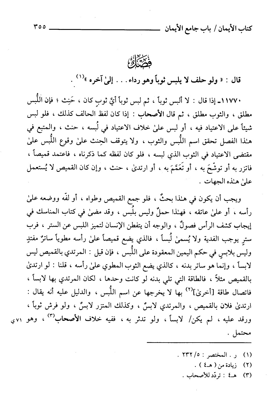 11770 - إذا قال: لا ألبس ثوباًً، ثم لبس ثوباً أيَّ ثوبٍ كان، حَنِث، فإن اللُّبس مطلق، والثوب مطلق، ثم قال الأصحاب: إذا كان لفظ الحالف كذلك، فلو لبس شيئاً على الاعتياد فيه، أو لبس على خلاف الاعتياد في لبسه، حنث، والمتبع في هذا الفصل تحقق اسم اللّبس والثوب، ولا يتوقف الحِنث على وقوع اللُّبس على مقتضى الاعتياد في الثوب الذي لبسه، فلو كان لفظه كما ذكرناه، فاعتمد قميصاً، فاتزر به أو توشّحَ به، أو تَعَمَّمَ به، أو ارتدى، حنث، وإن كان القميص لا يُستعمل على هذه الجهات.