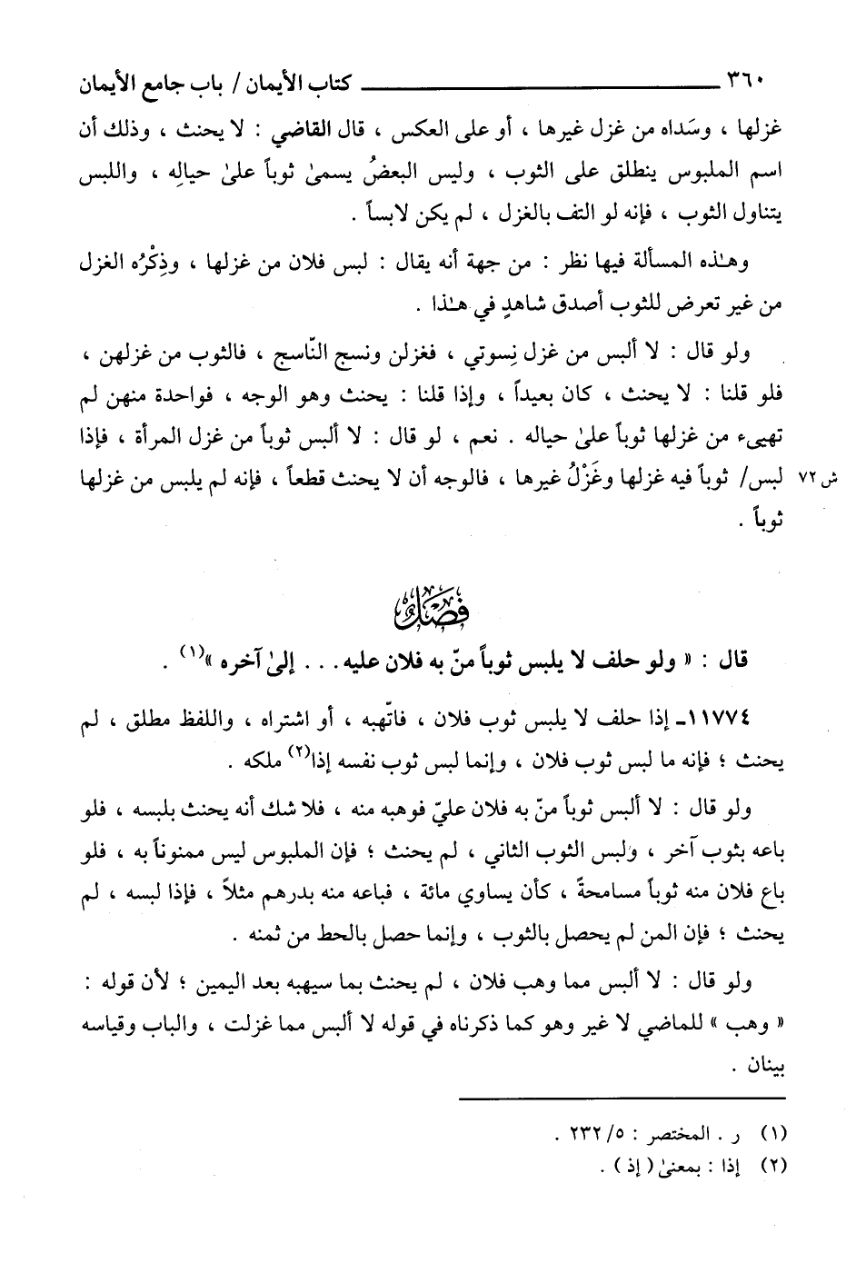 11774 - إذا حلف لا يلبس ثوب فلان، فاتّهبه، أو اشتراه، واللفظ مطلق، لم يحنث؛ فإنه ما لبس ثوب فلان، وإنما لبس ثوب نفسه إذا (2) ملكه.