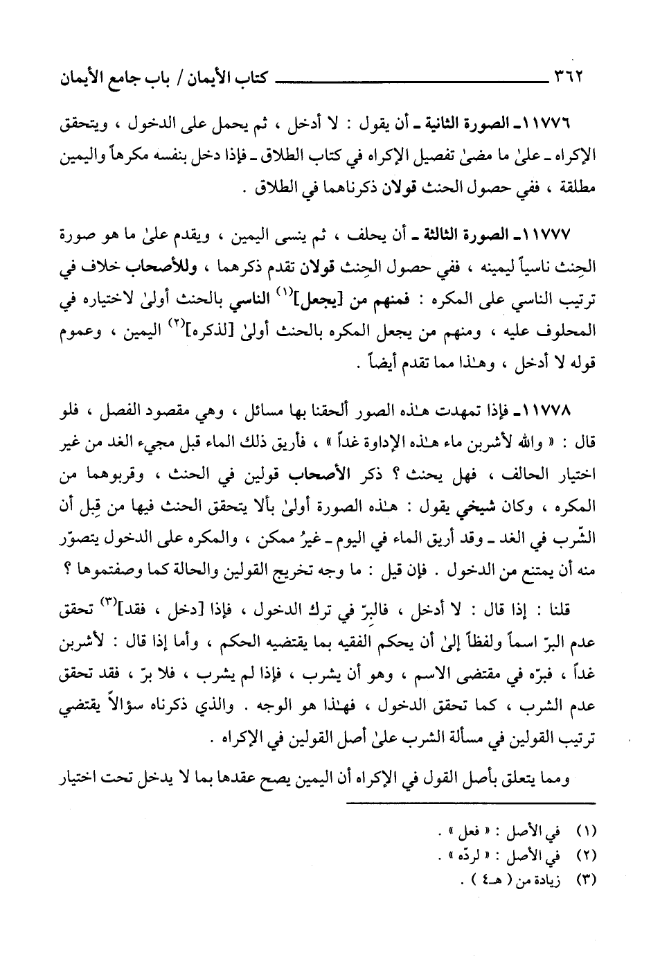 11777 - الصورة الثالثة - أن يحلف، ثم ينسى اليمين، ويقدم على ما هو صورة الحِنث ناسياً ليمينه، ففي حصول الحِنث قولان تقدم ذكرهما، وللأصحاب خلاف في ترتيب الناسي على المكره: فمنهم من [يجعل] (1) الناسي بالحنث أولى لاختياره في المحلوف عليه، ومنهم من يجعل المكره بالحنث أولى [لذكره] (2) اليمين، وعموم قوله لا أدخل، وهذا مما تقدم أيضاً.