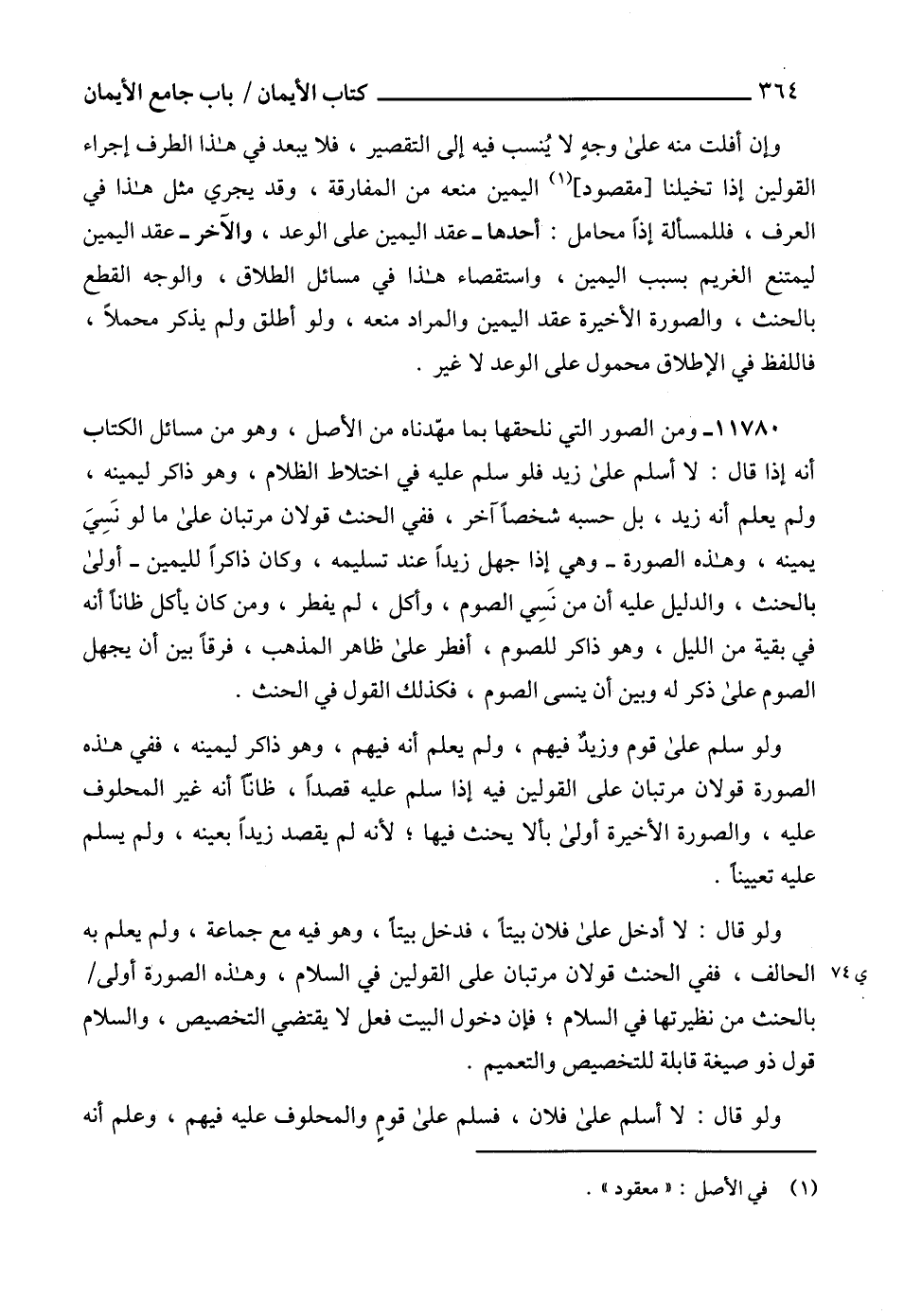 11780 - ومن الصور التي نلحقها بما مهّدناه من الأصل، وهو من مسائل الكتاب أنه إذا قال: لا أسلم على زيد فلو سلم عليه في اختلاط الظلام، وهو ذاكر ليمينه، ولم يعلم أنه زيد، بل حسبه شخصاً آخر، ففي الحنث قولان مرتبان على ما لو نَسِيَ يمينه، وهذه الصورة -وهي إذا جهل زيداً عند تسليمه، وكان ذاكراً لليمين- أولى بالحنث، والدليل عليه أن من نَسِي الصوم، وأكل، لم يفطر، ومن كان يأكل ظاناً أنه في بقية من الليل، وهو ذاكر للصوم، أفطر على ظاهر المذهب، فرقاً بين أن يجهل الصوم على ذكر له وبين أن ينسى الصوم، فكذلك القول في الحنث.