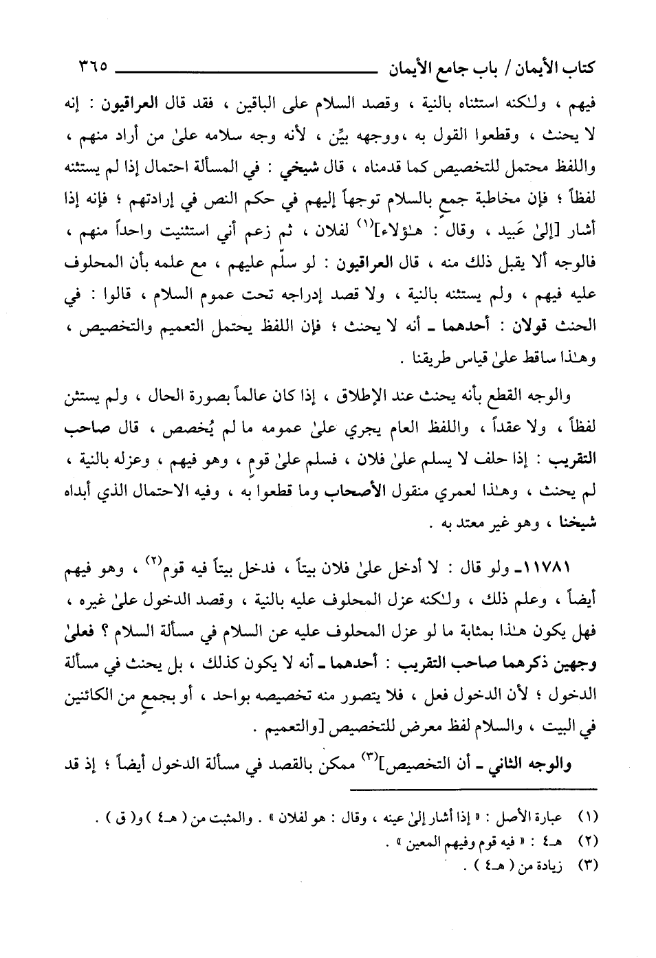 فيهم، ولكنه استثناه بالنية، وقصد السلام على الباقين، فقد قال العراقيون: إنه لا يحنث، وقطعوا القول به، ووجهه بيِّن، لأنه وجه سلامه على من أراد منهم، واللفظ محتمل للتخصيص كما قدمناه، قال شيخي: في المسألة احتمال إذا لم يستثنه لفظاً؛ فإن مخاطبة جمعٍ بالسلام توجهاً إليهم في حكم النص في إرادتهم؛ فإنه إذا أشار [إلى عَبيد، وقال: هؤلاء] (1) لفلان، ثم زعم أني استثنيت واحداً منهم، فالوجه ألا يقبل ذلك منه، قال العراقيون: لو سلّم عليهم، مع علمه بأن المحلوف عليه فيهم، ولم يستثنه بالنية، ولا قصد إدراجه تحت عموم السلام، قالوا: في