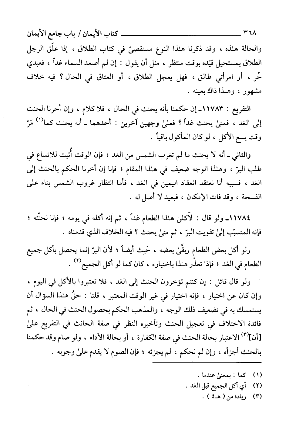 11784 - ولو قال: لآكلن هذا الطعام غداً، ثم إنه أكله في يومه؛ فإنا نحنّثه؛ فإنه المتسبّب إلى تفويت البرّ، ثم متى يحنث؟ فيه الخلاف الذي قدمناه.