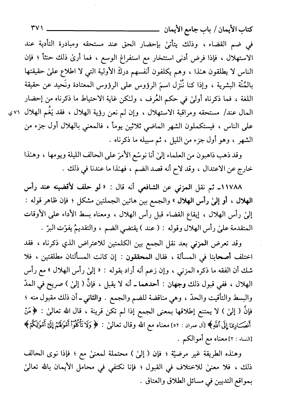 11788 - ثم نقل المزني عن الشافعي أنه قال: " لو حلف لأقضينه عند رأس الهلال، أو إلى رأس الهلال " والجمع بين هاتين الجملتين مشكل؛ فإن ظاهر قوله: إلى رأس الهلال، إيقاع القضاء قبل رأس الهلال، ومعناه بسط الأداء على الأوقات المتقدمة على رأس الهلال وقوله: (عند) يقتضي الضم، والتقديمُ يفوّت البرّ.