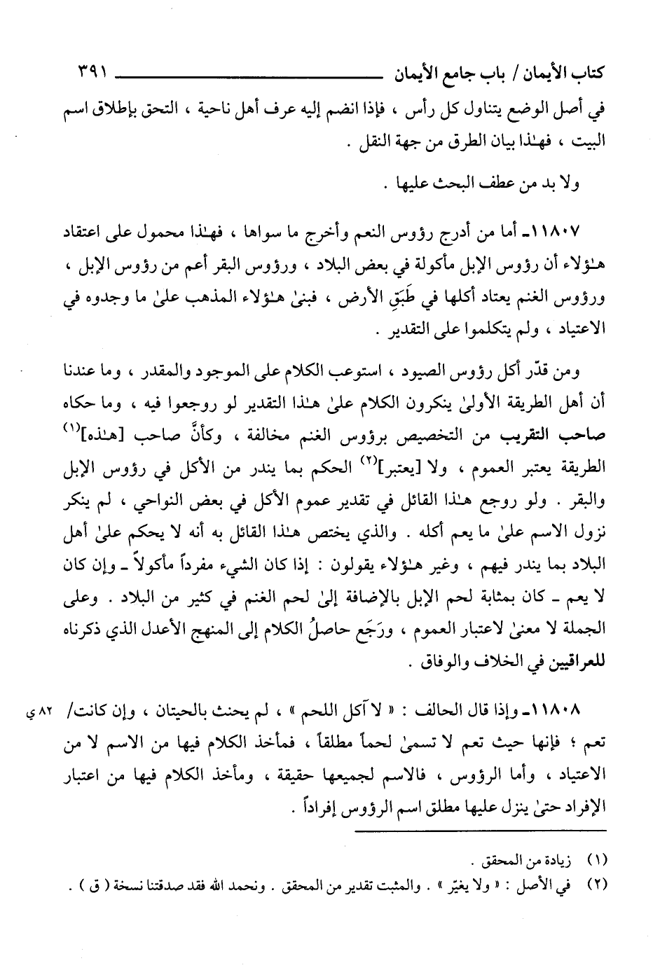 11807 - أما من أدرج رؤوس النعم وأخرج ما سواها، فهذا محمول على اعتقاد هؤلاء أن رؤوس الإبل مأكولة في بعض البلاد، ورؤوس البقر أعم من رؤوس الإبل، ورؤوس الغنم يعتاد أكلها في طَبَقِ الأرض، فبنى هؤلاء المذهب على ما وجدوه في الاعتياد، ولم يتكلموا على التقدير.