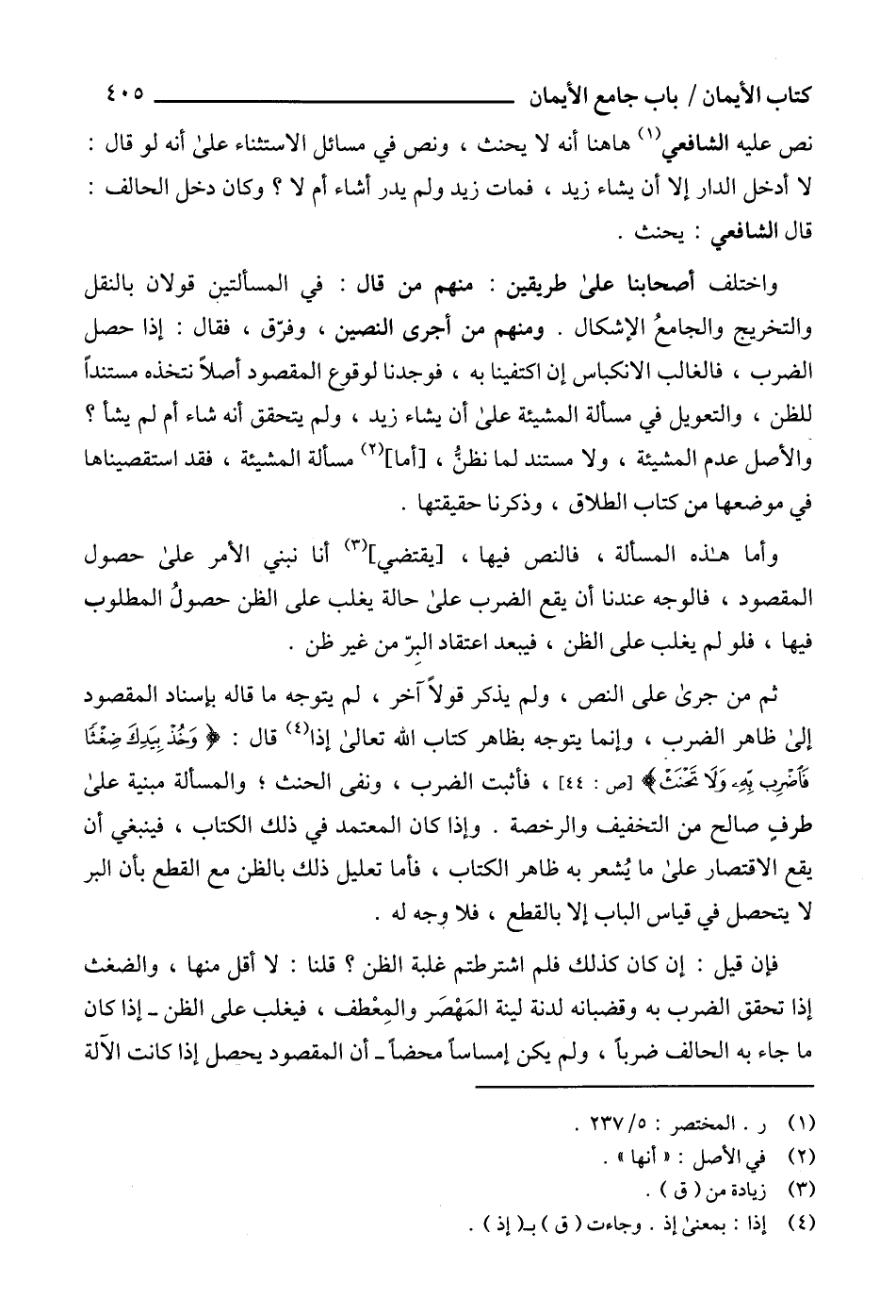 ثم من جرى على النص، ولم يذكر قولاً آخر، لم يتوجه ما قاله بإسناد المقصود إلى ظاهر الضرب، وإنما يتوجه بظاهر كتاب الله تعالى إذا (4) قال: {وَخُذْ بِيَدِكَ ضِغْثًا فَاضْرِبْ بِهِ وَلَا تَحْنَثْ} [ص: 44]، فأثبت الضرب، ونفى الحنث؛ والمسألة مبنية على طرفٍ صالح من التخفيف والرخصة. وإذا كان المعتمد في ذلك الكتاب، فينبغي أن يقع الاقتصار على ما يُشعر به ظاهر الكتاب، فأما تعليل ذلك بالظن مع القطع بأن البر لا يتحصل في قياس الباب إلا بالقطع، فلا وجه له.