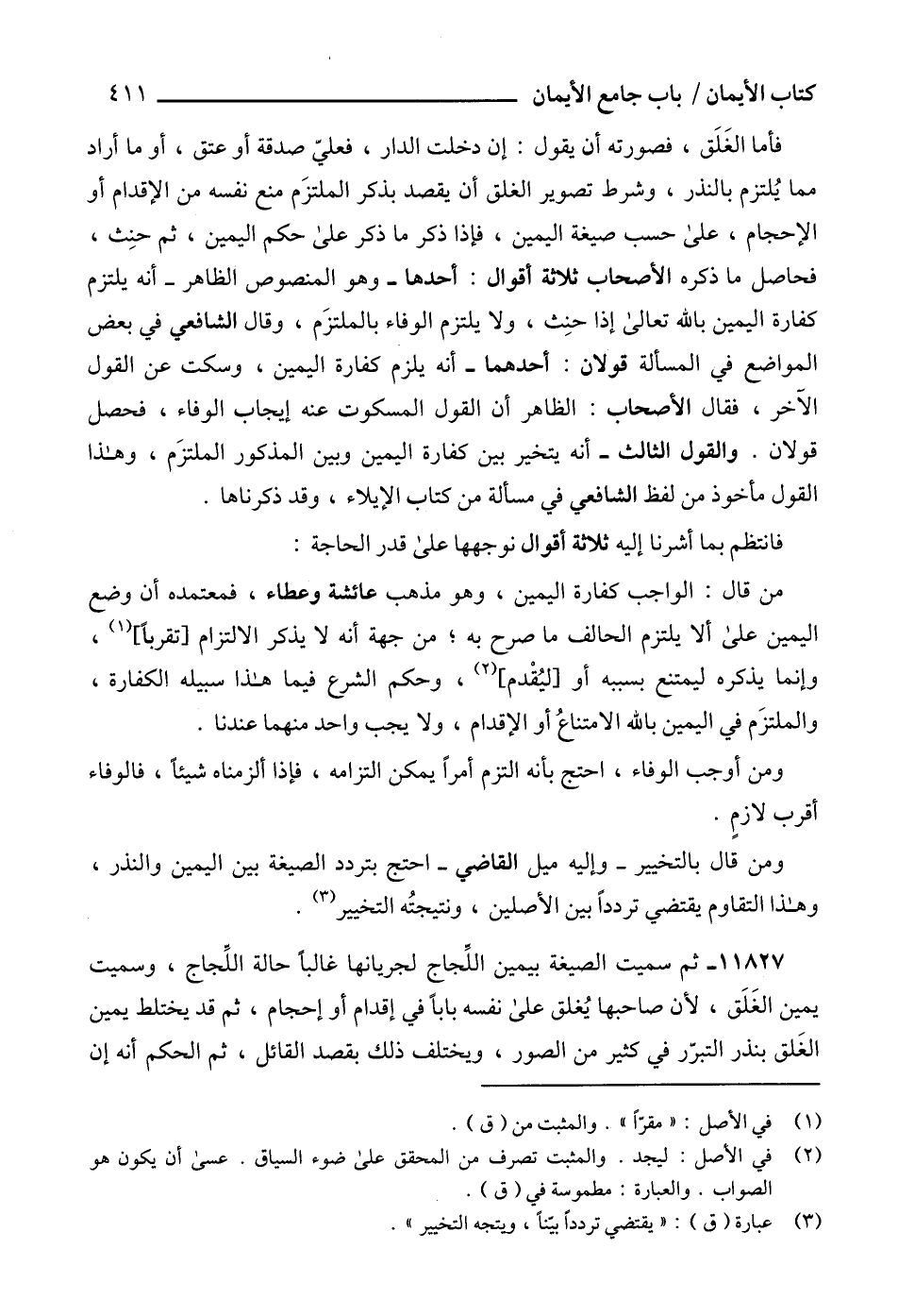 ومن قال بالتخيير -وإليه ميل القاضي- احتج بتردد الصيغة بين اليمين والنذر، وهذا التقاوم يقتضي تردداً بين الأصلين، ونتيجتُه التخيير (3).