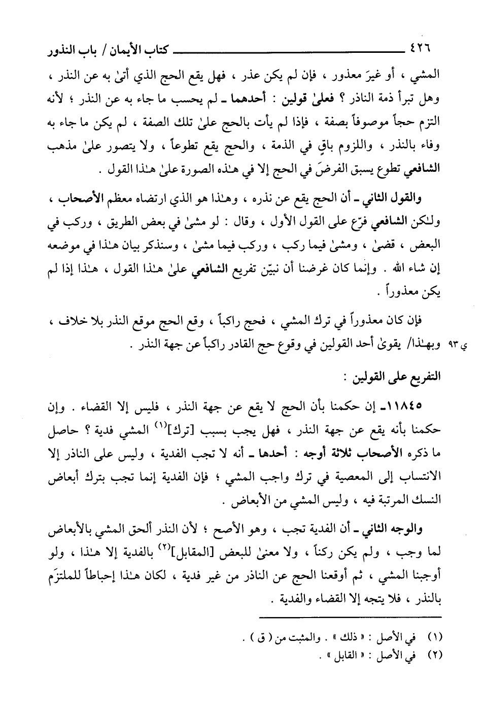 المشي، أو غيرَ معذور، فإن لم يكن عذر، فهل يقع الحج الذي أتى به عن النذر، وهل تبرأ ذمة الناذر؟ فعلى قولين: أحدهما - لم يحسب ما جاء به عن النذر؛ لأنه التزم حجاً موصوفاًً بصفة، فإذا لم يأت بالحج على تلك الصفة، لم يكن ما جاء به وفاء بالنذر، واللزوم باقٍ في الذمة، والحج يقع تطوعاً، ولا يتصور على مذهب الشافعي تطوع يسبق الفرضَ في الحج إلا في هذه الصورة على هذا القول.