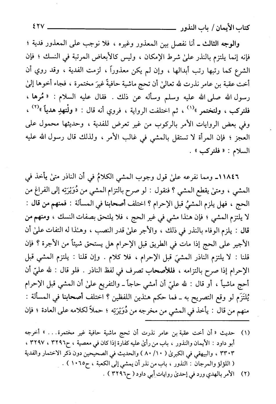 (1) حديث " أن أخت عقبة بن عامر نذرت أن تحج ماشية حافية غير مختمرة ... " أخرجه أبو داود: الأيمان والنذور، باب من رأى عليه كفارة إذا كان في معصية، ح 3296، 3297، 3303، والبيهقي في الكبرى (10/ 80) والحديث في الصحيحين دون ذكر الاختمار والفدية (اللؤلؤ والمرجان: النذور، باب من نذر أن يمشي إلى الكعبة، ح 1065).