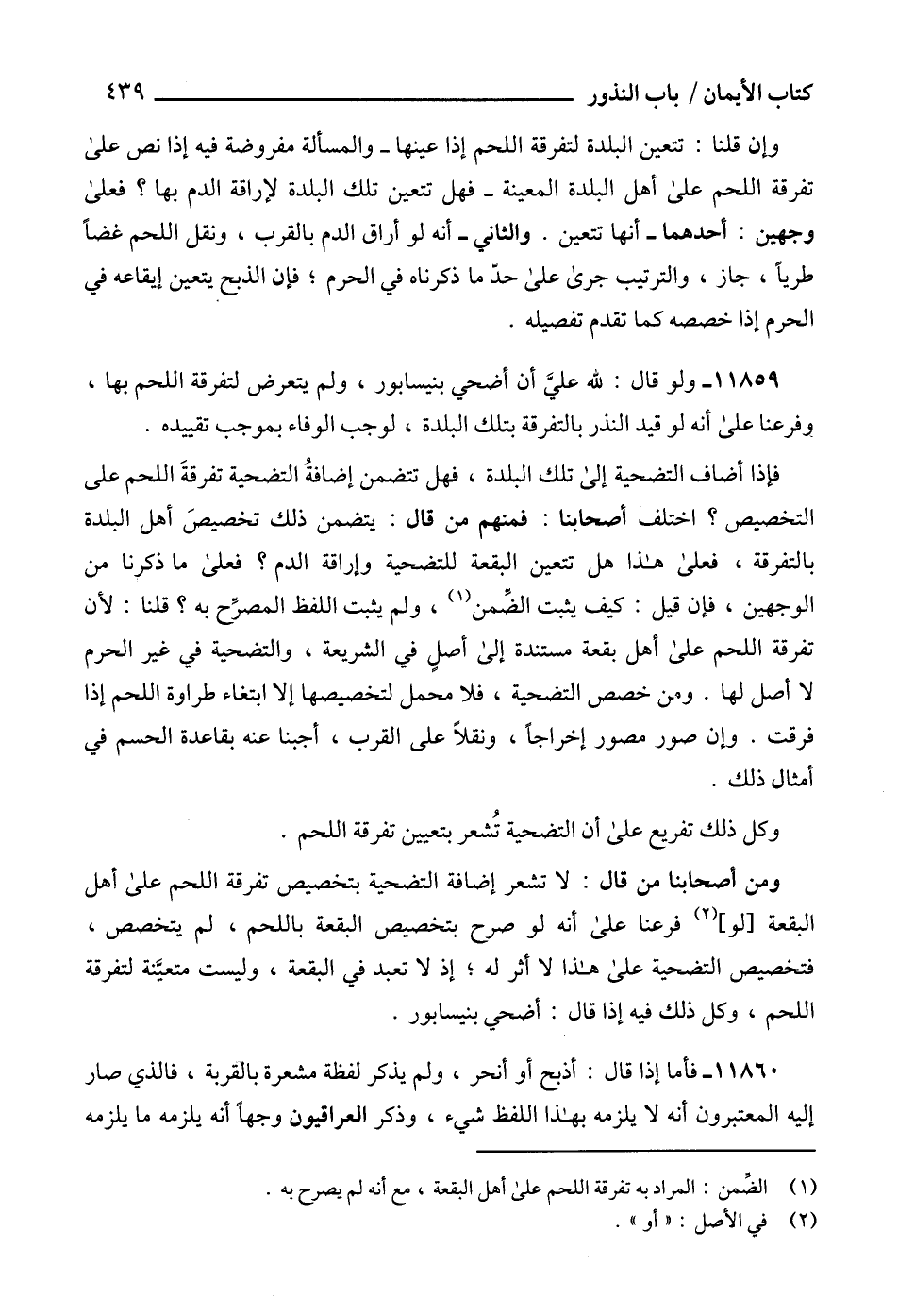 11859 - ولو قال: لله عليَّ أن أضحي بنيسابور، ولم يتعرض لتفرقة اللحم بها، وفرعنا على أنه لو قيد النذر بالتفرقة بتلك البلدة، لوجب الوفاء بموجب تقييده.