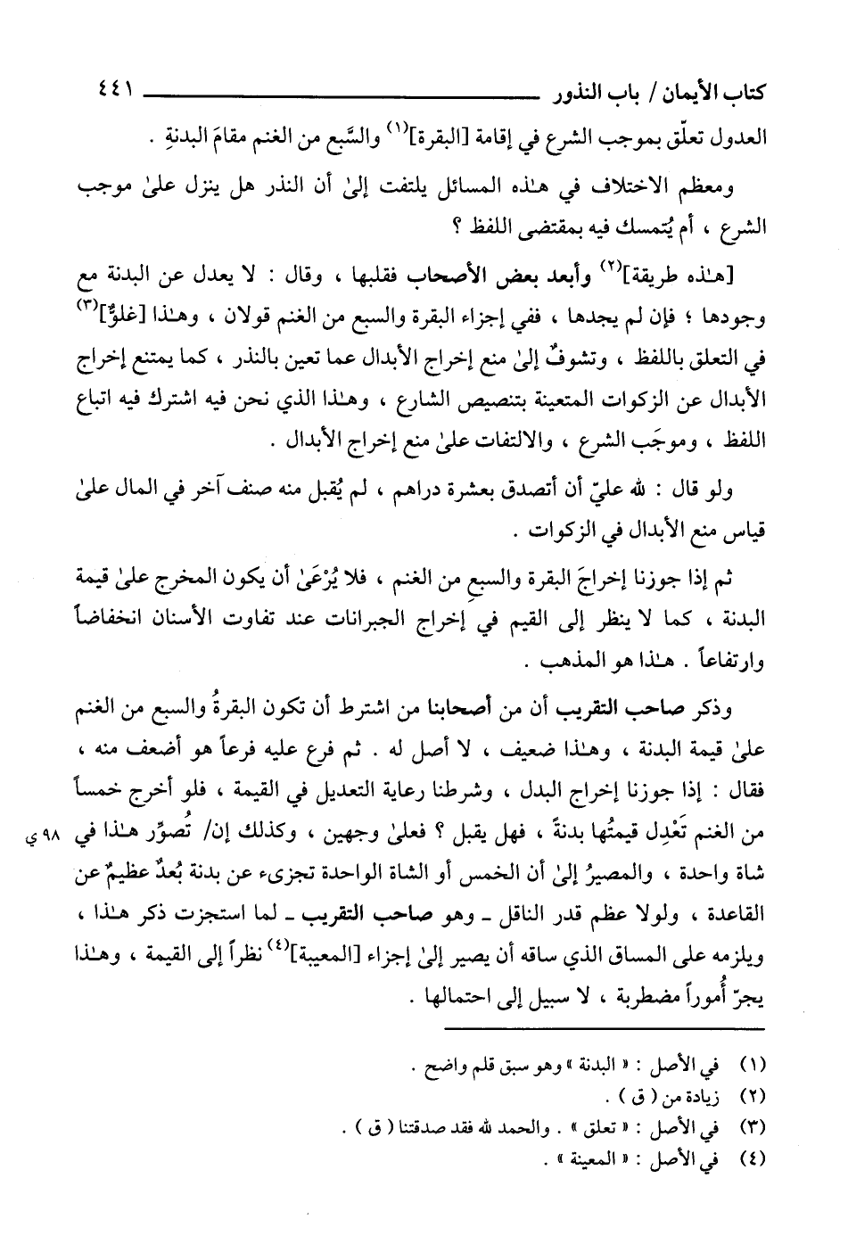 [هذه طريقة] (2) وأبعد بعض الأصحاب فقلبها، وقال: لا يعدل عن البدنة مع وجودها؛ فإن لم يجدها، ففي إجزاء البقرة والسبع من الغنم قولان، وهذا [غلوٌّ] (3) في التعلق باللفظ، وتشوف إلى منع إخراج الأبدال عما تعين بالنذر، كما يمتنع إخراج الأبدال عن الزكوات المتعينة بتنصيص الشارع، وهذا الذي نحن فيه اشترك فيه اتباع اللفظ، وموجَب الشرع، والالتفات على منع إخراج الأبدال.