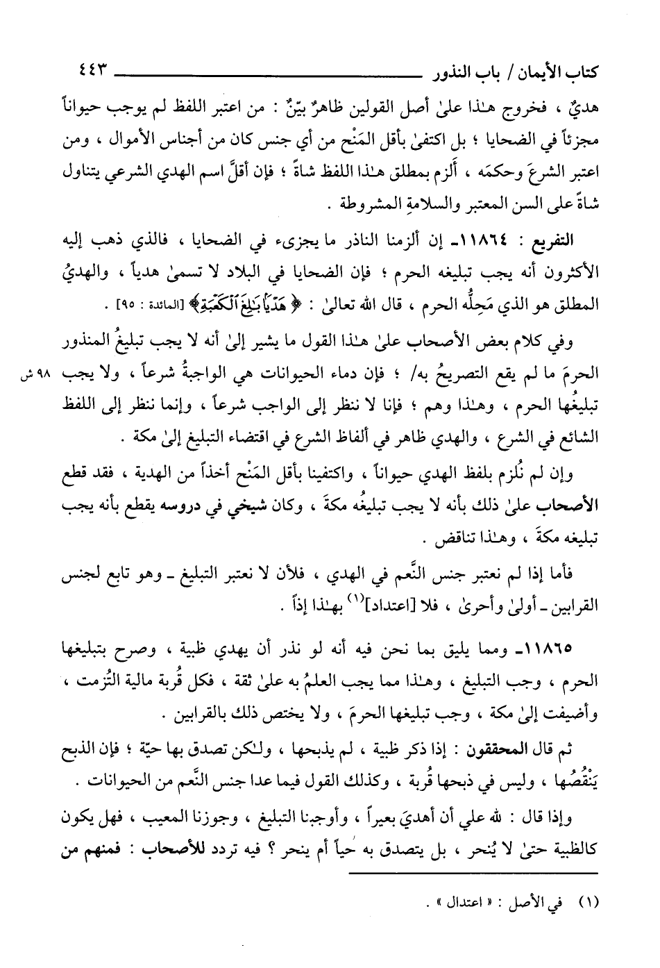 وفي كلام بعض الأصحاب على هذا القول ما يشير إلى أنه لا يجب تبليغُ المنذور الحرمَ ما لم يقع التصريحُ به؛ فإن دماء الحيوانات هي الواجبةُ شرعاً، ولا يجب تبليغُها الحرم، وهذا وهم؛ فإنا لا ننظر إلى الواجب شرعاً، وإنما ننظر إلى اللفظ الشائع في الشرع، والهدي ظاهر في ألفاظ الشرع في اقتضاء التبليغ إلى مكة.
