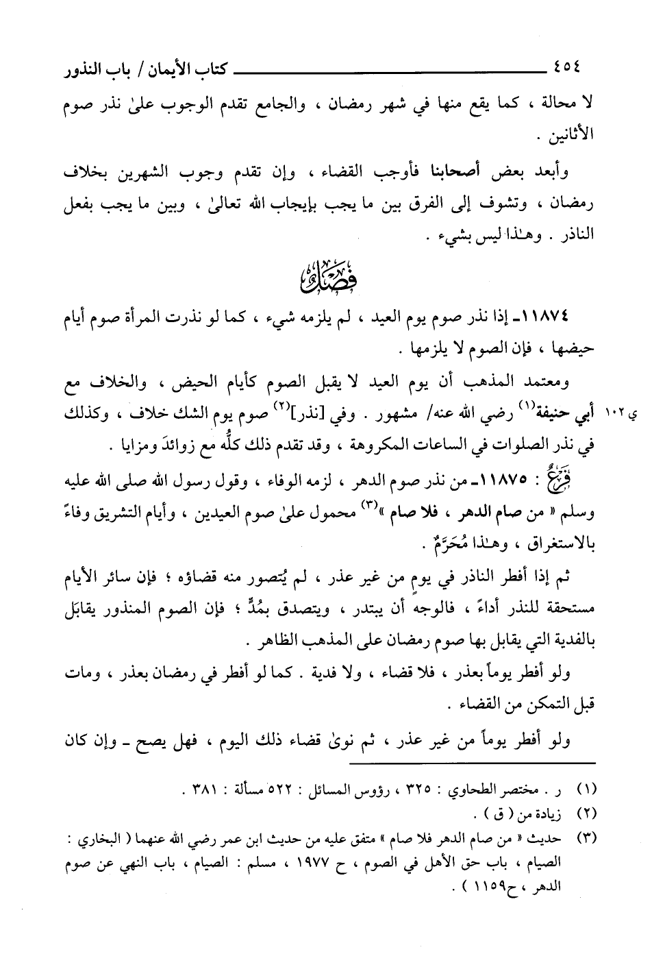 11875 - من نذر صوم الدهر، لزمه الوفاء، وقول رسول الله صلى الله عليه وسلم " من صام الدهر، فلا صام " (3) محمول على صوم العيدين، وأيام التشريق وفاءً بالاستغراق، وهذا مُحَرَّمٌ.
