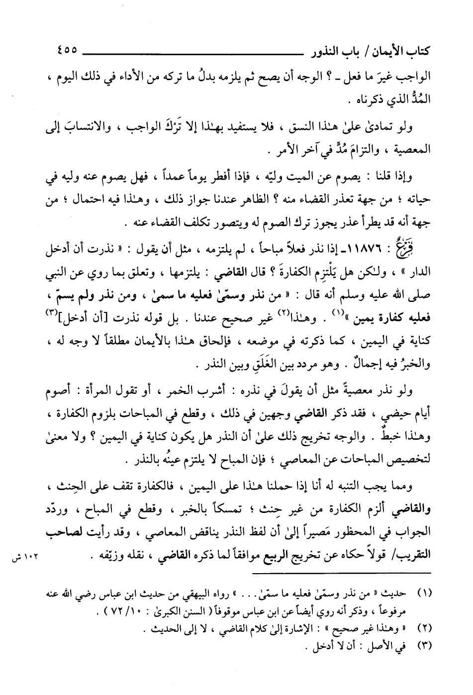 (1) حديث " من نذر وسمّى فعليه ما سمّى ... " رواه البيهقي من حديث ابن عباس رضي الله عنه مرفوعاً، وذكر أنه روي أيضاً عن ابن عباس موقوفاً (السنن الكبرى: 10/ 72).