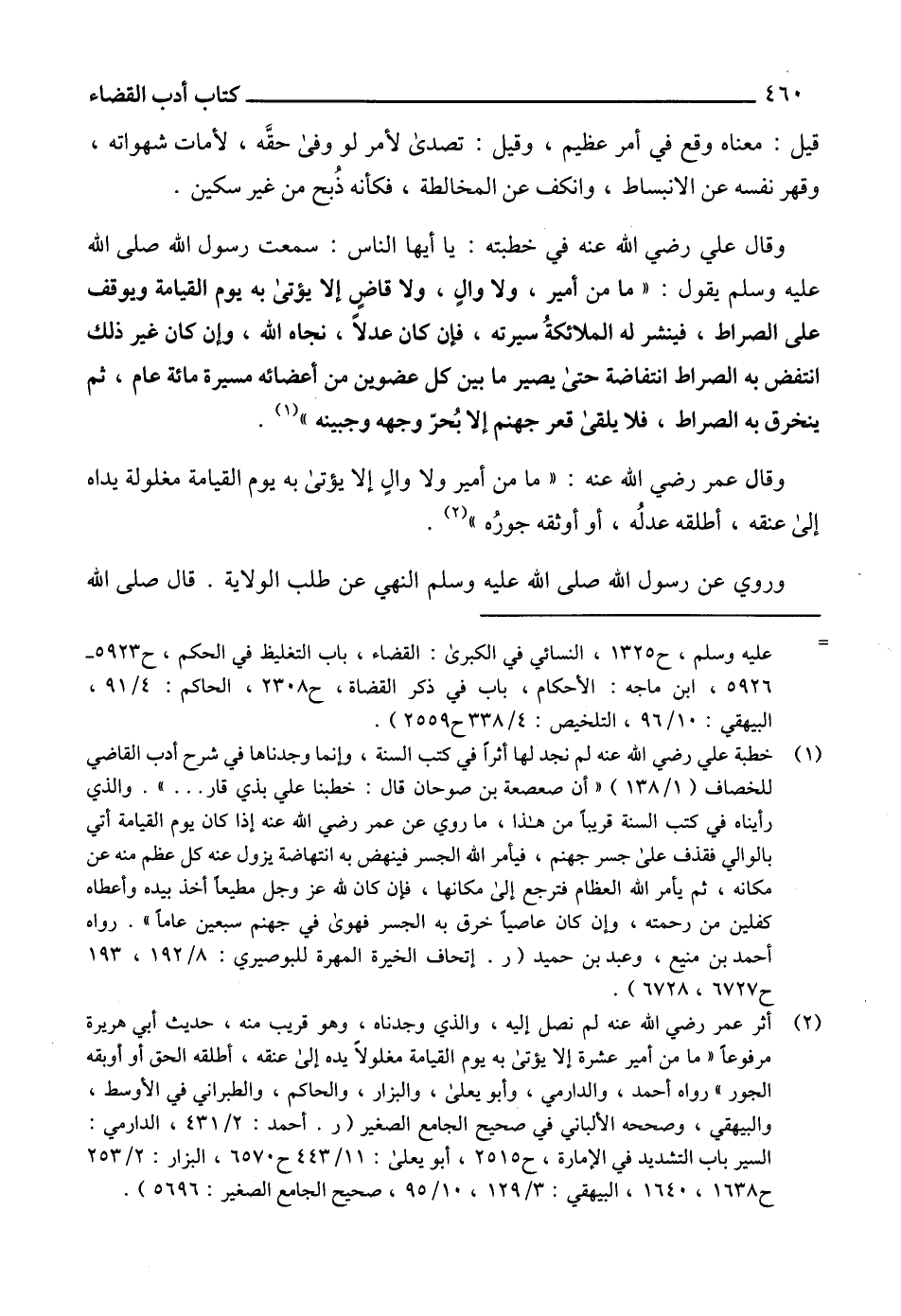 (1) خطبة علي رضي الله عنه لم نجد لها أثراً في كتب السنة، وإنما وجدناها في شرح أدب القاضي للخصاف (1/ 138) "أن صعصعة بن صوحان قال: خطبنا علي بذي قار ... ". والذي رأيناه في كتب السنة قريباً من هذا، ما روي عن عمر رضي الله عنه إذا كان يوم القيامة أتي بالوالي فقذف على جسر جهنم، فيأمر الله الجسر فينهض به انتهاضة يزول عنه كل عظم منه عن مكانه، ثم يأمر الله العظام فترجع إلى مكانها، فإن كان لله عز وجل مطيعاً أخذ بيده وأعطاه كفلين من رحمته، وإن كان عاصياً خرق به الجسر فهوى في جهنم سبعين عاماً". رواه أحمد بن منيع، وعبد بن حميد (ر. إتحاف الخيرة المهرة للبوصيري: 8/ 192، 193 ح 6727، 6728).