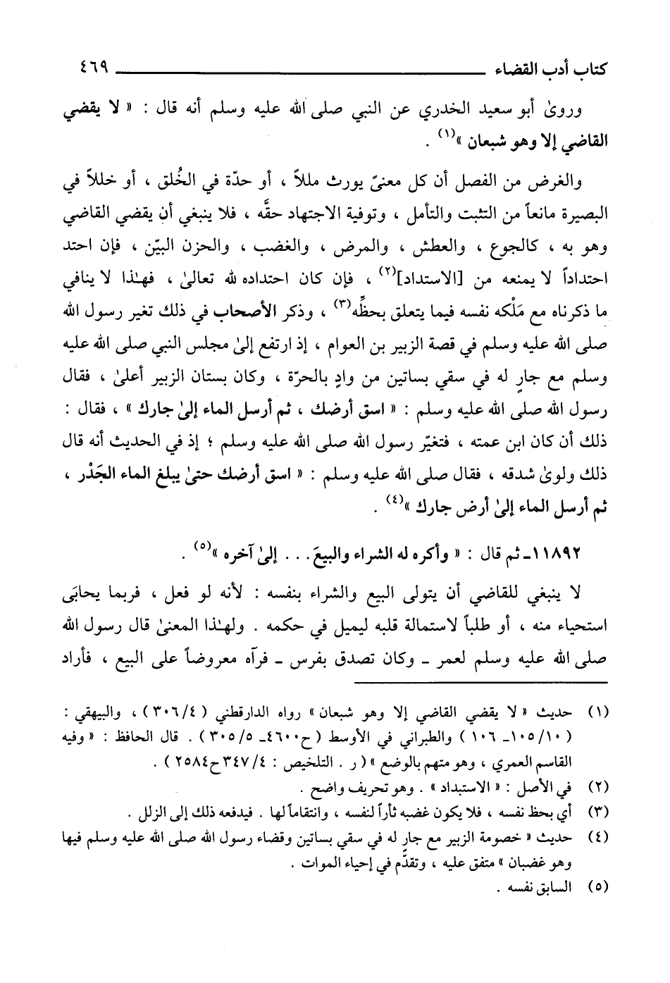 (4) حديث " خصومة الزبير مع جارٍ له في سقي بساتين وقضاء رسول الله صلى الله عليه وسلم فيها وهو غضبان " متفق عليه، وتقدّم في إحياء الموات.