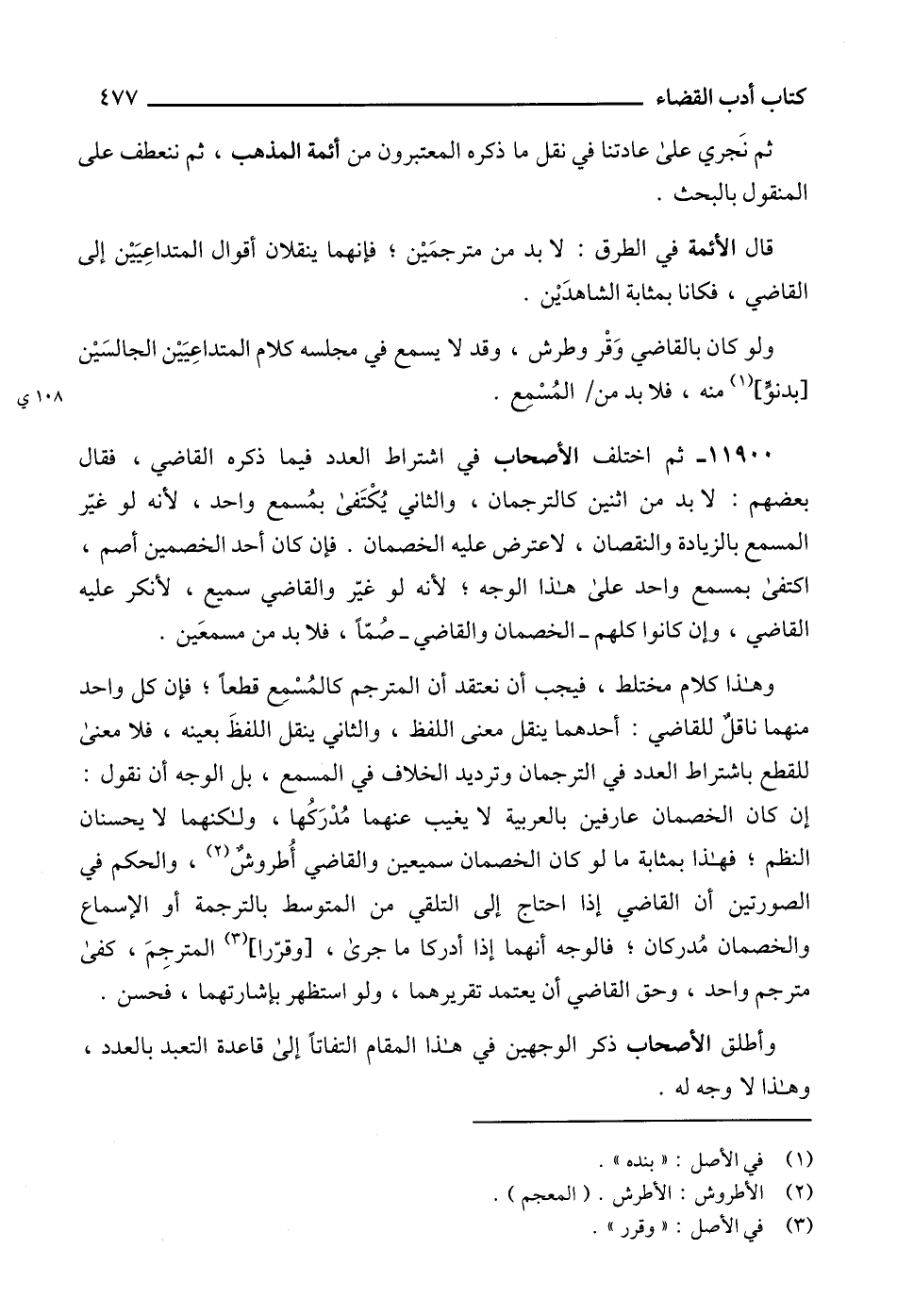 11900 - ثم اختلف الأصحاب في اشتراط العدد فيما ذكره القاضي، فقال بعضهم: لا بد من اثنين كالترجمان، والثاني يُكْتَفى بمُسمع واحد، لأنه لو غيّر المسمع بالزيادة والنقصان، لاعترض عليه الخصمان. فإن كان أحد الخصمين أصم، اكتفى بمسمع واحد على هذا الوجه؛ لأنه لو غيّر والقاضي سميع، لأنكر عليه القاضي، وإن كانوا كلهم -الخصمان والقاضي- صُمّاً، فلا بد من مسمعَين.
